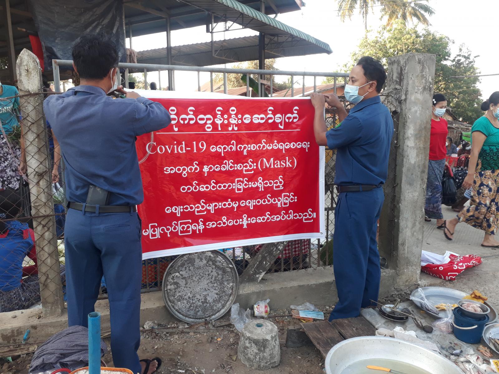 အဆိုပါအသိပညာပေးခြင်းများကို ချောင်းဆုံမြို့နယ်တွင် မြို့နယ်စည်ပင်သာယာရေး အဖွဲ့ပိုင် ဈေးများ ဖြစ်သည့် ချောင်းဆုံမြို့မအမှတ်(၁)ဈေး၊ မြို့မအမှတ်(၂)ဈေး၊ ရွာလွတ် ဈေး၊ ကမာမိုဈေး၊ မုရစ်ကလေး ဈေးစသည့် အဖွဲ့ပိုင်ဈေး(၅)ဈေးတို့တွင် မြို့နယ်စည်ပင် သာယာရေးအဖွဲ့ဝန်ထမ်းများမှ ဈေးရောင်း ဈေးဝယ်ရာ တွင် နှာခေါင်းစည်း(Mask) တပ်ဆင်ကြရန်လက်ကိုင်အသံချဲ့စက်ဖြင့် အသိပေး ကြေငြာခြင်း၊ ဈေး၏အများ ပြည်သူမြင်သာသည့် နေရာများတွင် ဗီနိုင်းပိုစတာများချိတ်ဆွဲထားခြင်းများ ကို ဆောင်ရွက် ခဲ့ ကြောင်း သိရသည်။