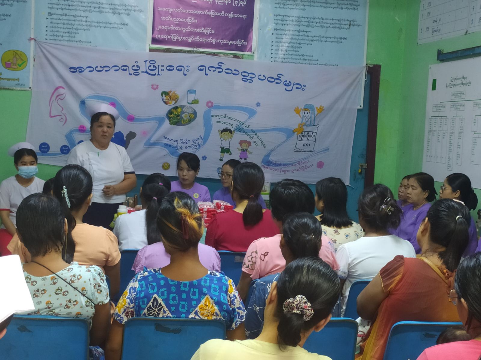 ရန်ကုန်တိုင်းဒေသကြီး ကမာရွတ်ခရိုင် ကမာရွတ်မြို့နယ်မိခင်နှင့် ကလေးစောင့်ရှောက်ရေးအသင်းနှင့် မြို့နယ်ပြည်သူ့ကျန်းမာရေးဦးစီးဌာန ဆောင်ရွက်သည့် မိခင်နို့စနစ်တကျတိုက်ကျွေးရေး ရက်သတ္တပတ်လှုပ်ရှားမှု ကိုယ်ဝန်ဆောင်မိခင်များအား မိခင်နို့စနစ်တကျတိုက်ကျွေးရေး အသိပညာပေးဟောပြောပွဲကို ဩဂုတ် ၁၂ ရက် နံနက် ၁ဝ နာရီက မြို့နယ်ပြည်သူ့ကျန်းမာရေးဦးစီးဌာန အစည်းအဝေးခန်းမ၌ ကျင်းပခဲ့သည်။