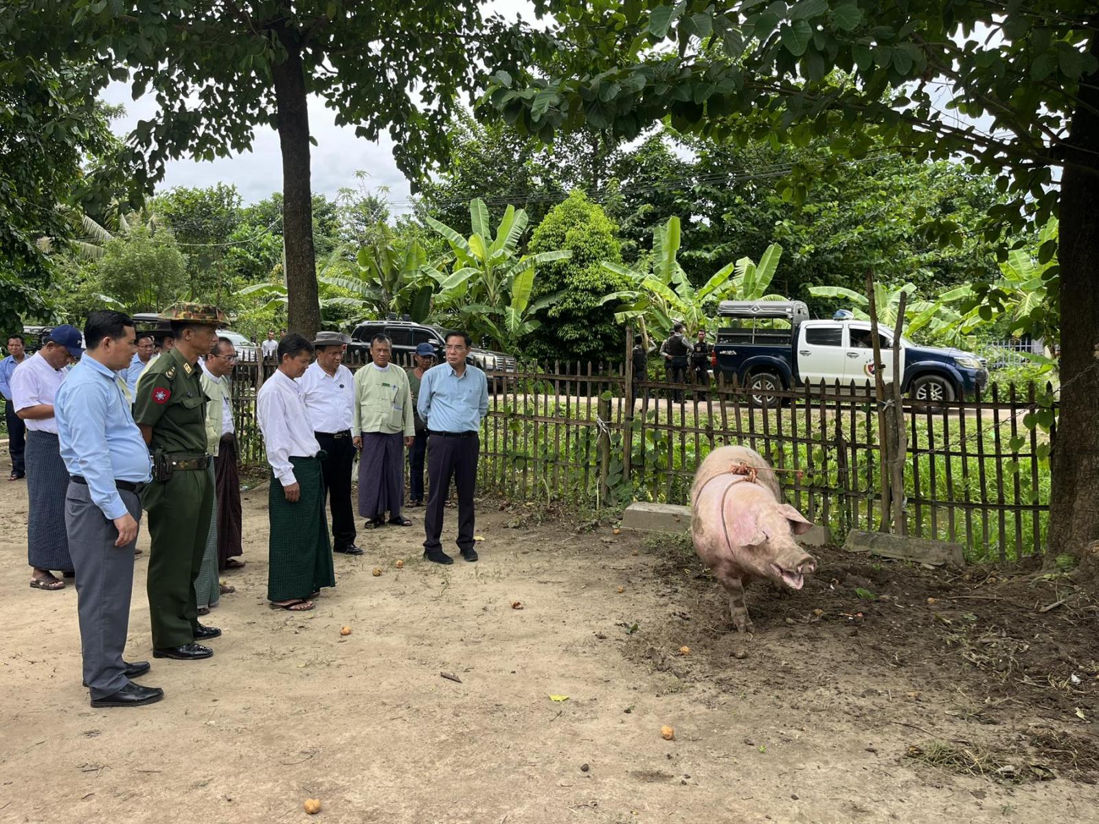 ဆက်လက်၍ ဝန်ကြီးချုပ်နှင့် အဖွဲ့သည် မိုးညိုမြို့၊ မြို့မရပ်ကွက်၊ ရွှေမကျီးပင်လမ်းရှိ ဝက်မွေးမြူရေးလုပ်ကိုင်သူ ဦးသန်းထိုက်၏ အသားတိုးမျိုးဝက်ခြံသို့ ရောက်ရှိ၍ အသားတိုးမျိုးဝက်များ မွေးမြူထားရှိမှုအခြေအနေများအား မေးမြန်းရာ တာဝန်ရှိသူများက AI နည်းစနစ်ဖြစ် မျိုးထုတ်လုပ်မှုလုပ်ငန်းဆောင်ရွက်မှုအခြေအနေများ၊ မွေးမြူထားသည့် ဝက်အမျိုးအစားများနှင့် မွေးမြူရေးလုပ်ကိုင်ဆောင်ရွက်နေမှုများအား ပြန်လည်ဖြေကြားခဲ့ရာ စွန့်ပစ်ပစ္စည်းများနှင့် ပတ်သက်၍ ပတ်ဝန်းကျင်ညစ်ညမ်းမှုမရှိစေရေး စနစ်တကျဆောင်ရွက်ရန်နှင့် လိုအပ်သည်များကို လမ်းညွှန်မှာကြားခဲ့ကြောင်း သိရသည်။