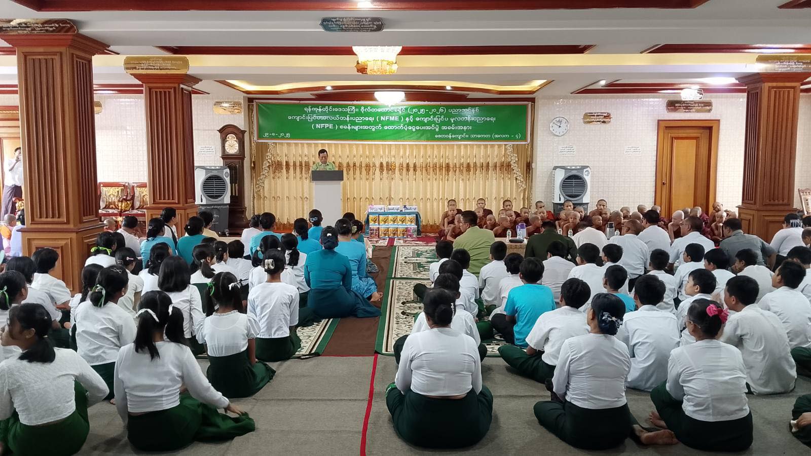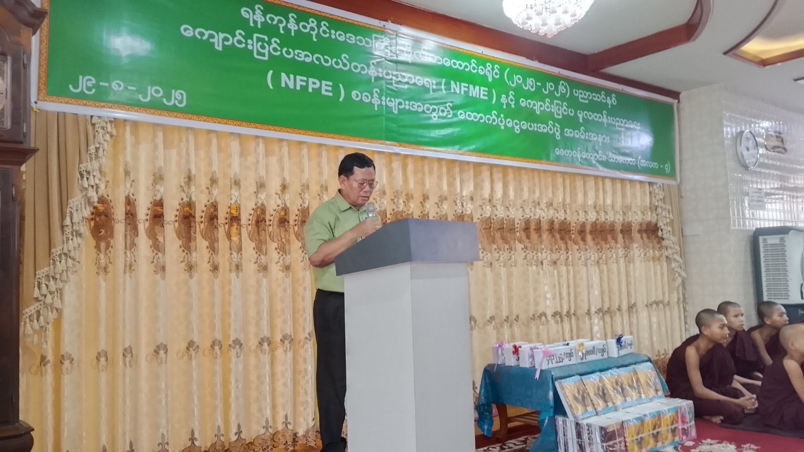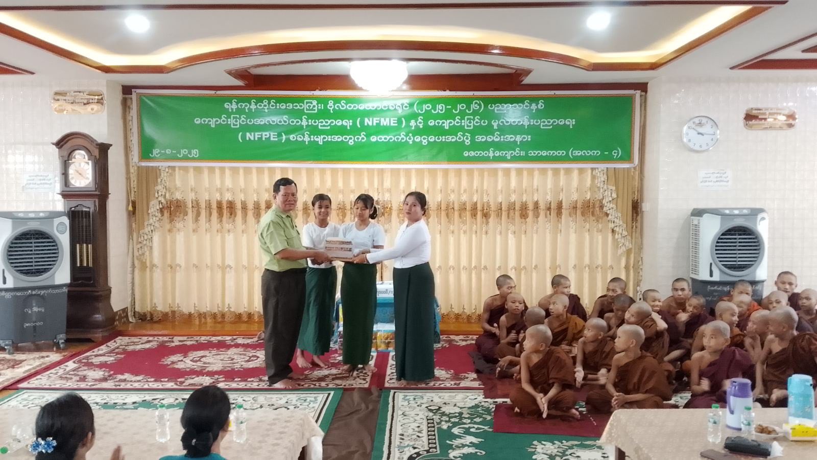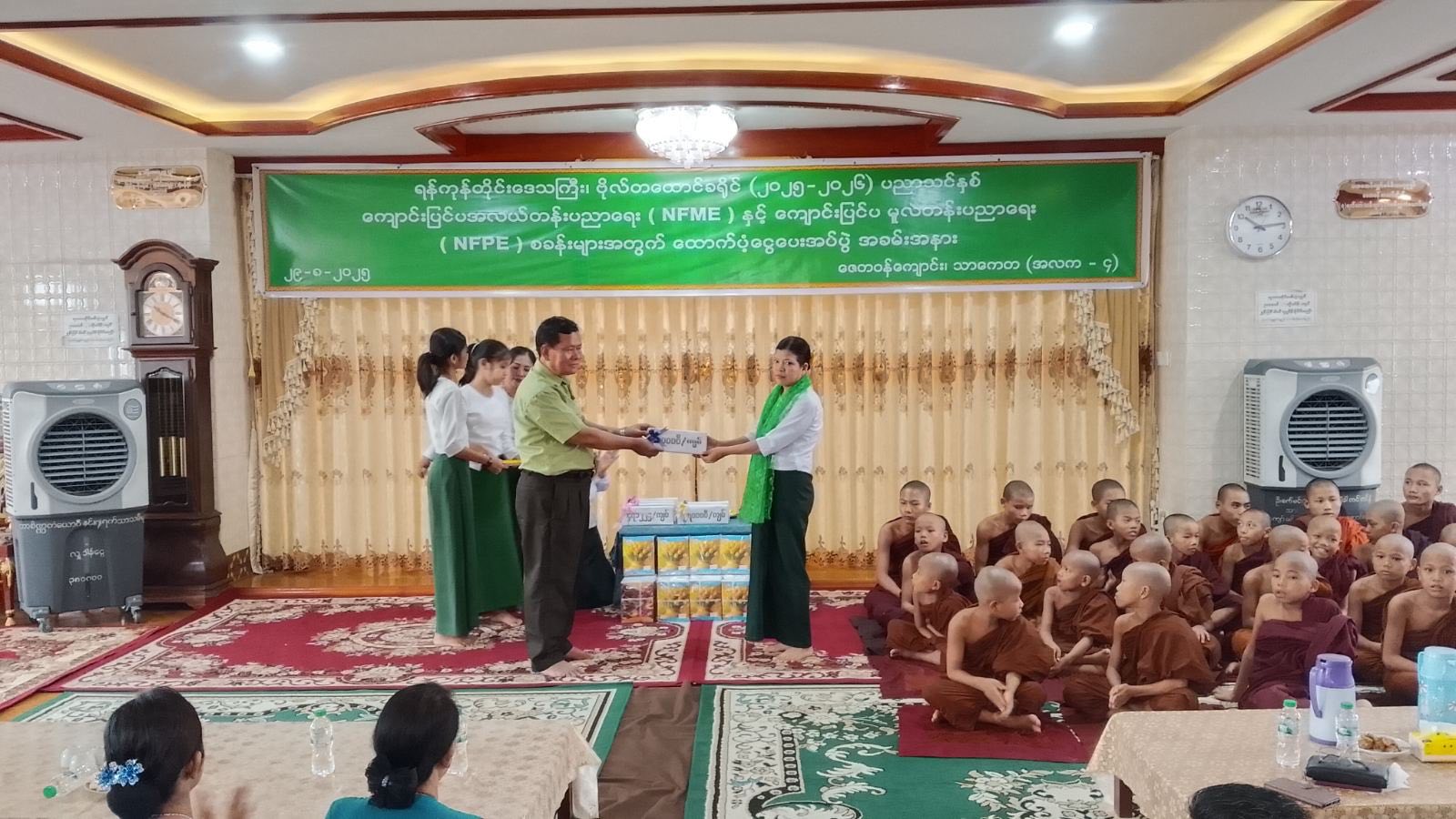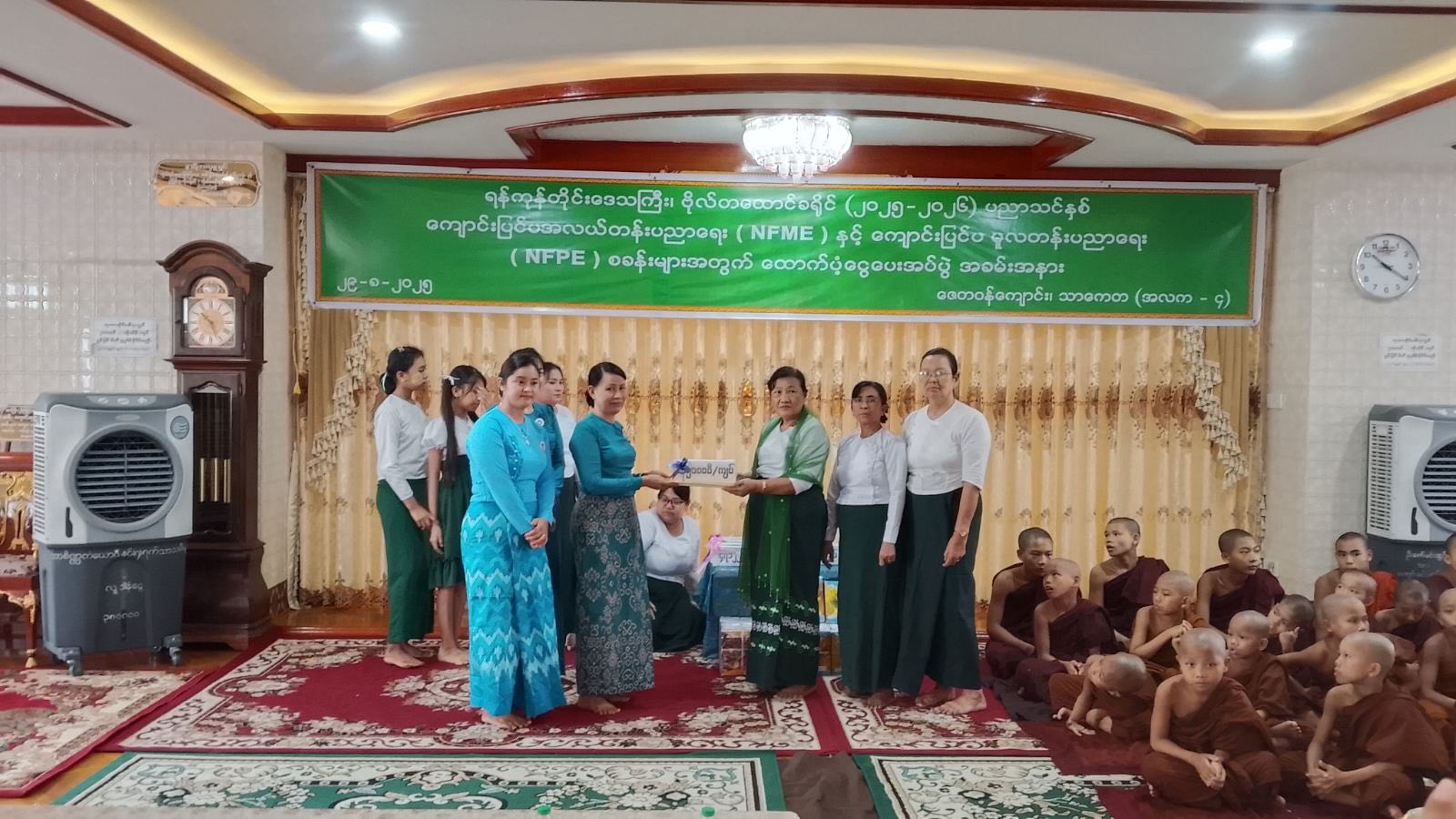 ရန်ကုန်တိုင်းဒေသကြီး၊ ဗိုလ်တစ်ထောင်ခရိုင်၊ သာကေတမြို့နယ်၌ ၂၀၂၅-၂၀၂၆ ပညာသင်နှစ် ကျောင်းပြင်ပ အလယ်တန်းပညာရေး (NFME) နှင့် ကျောင်းပြင်ပမူလတန်းပညာရေး (NFPE) စခန်းများအတွက် ထောက်ပံ့ငွေပေးအပ်ခြင်းအခမ်းအနားကို ရှုခင်းသာရပ်ကွက်၊ ဇေတဝန်စာသင်တိုက်တွင် ယမန်နေ့နံနက် (၉:၃၀) အချိန်က ကျင်းပပြုလုပ်ခဲ့ကြောင်း သိရသည်။