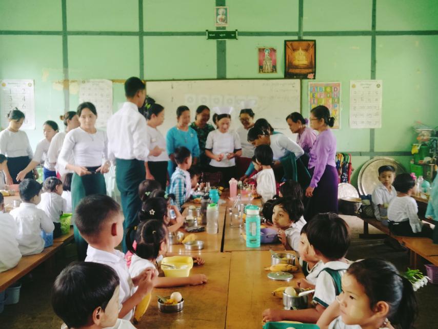 ထိုသို့ဆောင်ရွက်ရာတွင် မြို့နယ်ပြည်သူ့ကျန်းမာရေးဌာနတာဝန်ရှိသူများက ဆရာ၊ ဆရာမများနှင့် ကျောင်းသားမိဘများအား အာဟာတိုက်ကျွေးရခြင်း ရည်ရွယ်ချက်များကို ရှင်းလင်းပြောကြားပြီး ကျောင်းတွင်းအာဟာရကျွေးမွေးခြင်းကို မြိုနယ်ပြည်သူ့ကျန်းမာရေးဌာန တာဝန်ရှိသူများက ဦးဆောင်ကာ ကျောင်းအုပ်ကြီးနှင့် ဆရာ၊ ဆရာမများက KG တန်း ကလေးငယ်များအား ကျန်းမာရေးနှင့်ညီညွတ်သော နေ့လယ်စာများကို စနစ်တကျ ကျွေးမွေးကြကြောင်း သိရသည်။