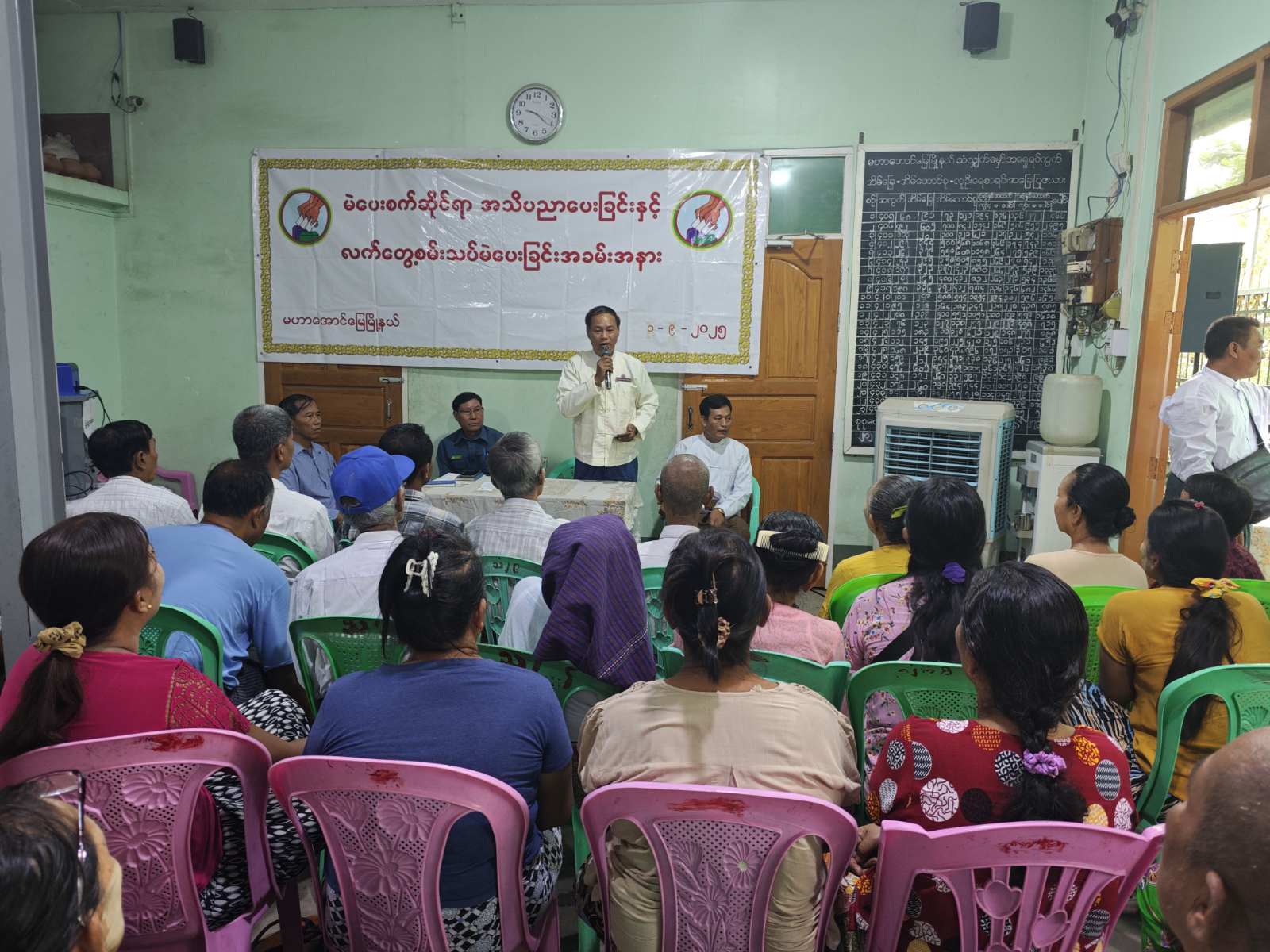 အလားတူ မဟာအောင်မြေမြို့နယ် မြန်မာအီလက်ထရောနစ်မဲပေးစက်ဆိုင်ရာ အသိပညာပေး အခမ်းအနားကို ရတနာဘုမ္မိ အနောက်ရပ်ကွက် ဒဟတ္တောဗိမာန်တော်၌ စက်တင်ဘာ(၁)ရက်က ကျင်းပရာ ဒုတိယမြို့နယ်အုပ်ချုပ်ရေးမှူး ဦးကျော်လင်းခိုင်က အမှာစကားပြောကြားသည်။