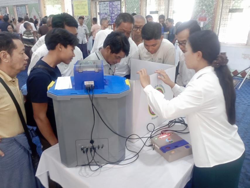ဆက်လက်၍ မြို့နယ်ရွေးကောက်ပွဲကော်မရှင်အဖွဲ့ခွဲ အတွင်းရေးမှူး ဦးရဲမင်းလွင်က မဲဆန္ဒရှင်များအား မြန်မာအီလက်ထရော နစ်မဲပေးစက် သုံးစွဲပုံအဆင့်ဆင့်များကို ရှင်းလင်းပြောကြားပြီးနောက် ကိုင်တွယ်အသုံးပြုပုံနည်းစနစ်များကို ရှင်းလင်းပြသကာ ပြည်သူများက ကိုယ်တိုင် စမ်းသပ်မဲပေးခြင်းများကို လက်တွေ့ ဆောင်ရွက်ခဲ့ကြသည်။
