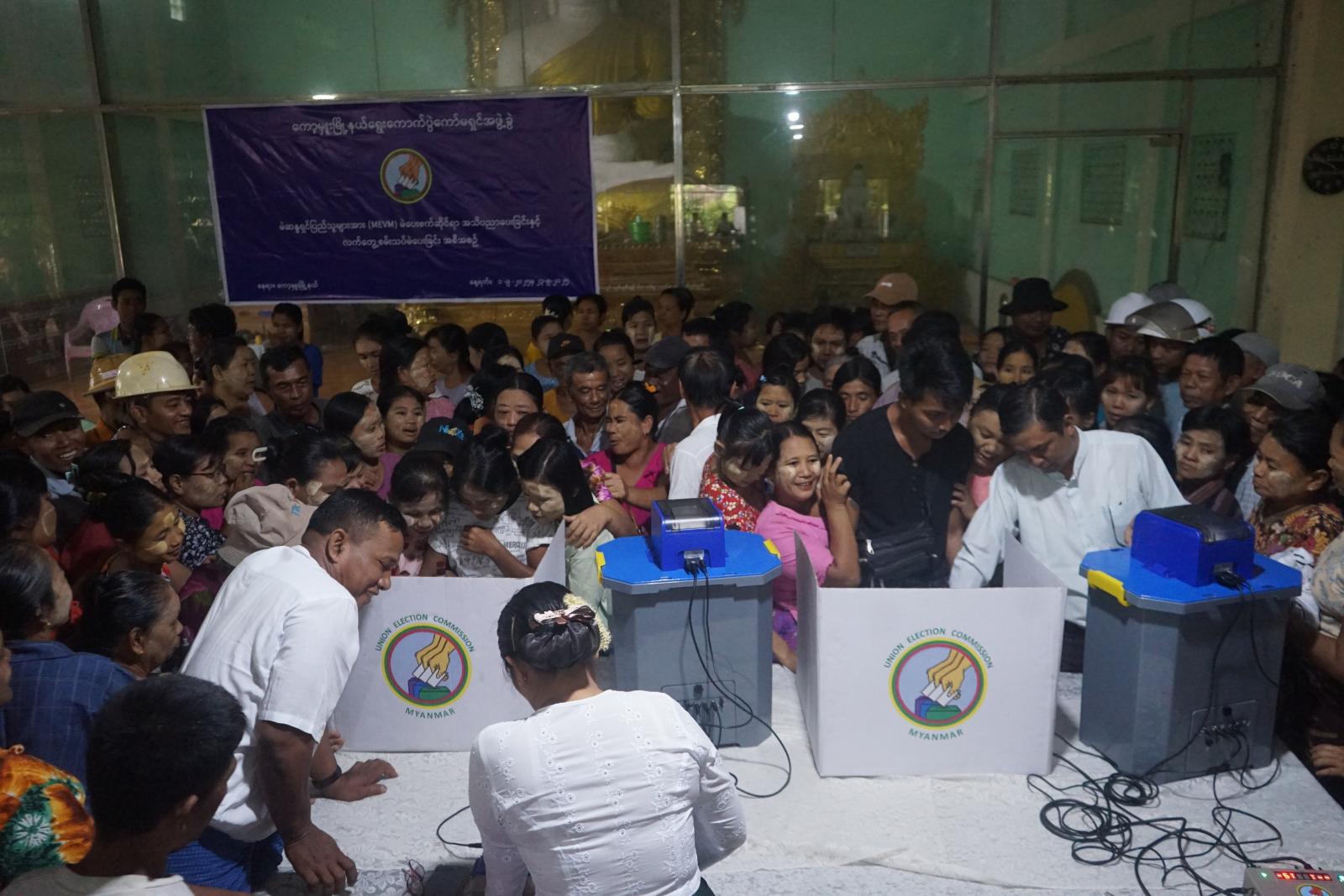 ရန်ကုန်တိုင်းဒေသကြီး၊ တွံတေးခရိုင်၊ ကော့မှူးမြို့နယ်တွင် မြန်မာအီလက်ထရောနစ်မဲပေးစက် (MEVM) အသုံးပြုခြင်းဆိုင်ရာ အသိပညာပေးဟောပြောခြင်းနှင့် လက်တွေ့စမ်းသပ်ဆန္ဒမဲပေးခြင်း သရုပ်ပြခြင်းအခမ်းအနားကို ယနေ့နံနက်က ဘုရားလမ်းရပ်ကွက်၊ မဟာဝိဇ္ဇောဒယ ဘုန်းတော်ကြီးကျောင်း၌ ကျင်းပခဲ့ကြောင်း သိရသည်။