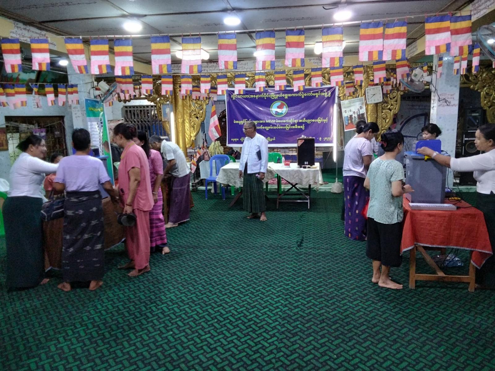 ရန်ကုန်တိုင်းဒေသကြီး၊ အင်းစိန်ခရိုင်၊ လှိုင်သာယာ(အနောက်ပိုင်း)မြို့နယ်တွင် မြို့နယ်ရွေးကောက်ပွဲကော်မရှင်အဖွဲ့ခွဲမှ ဦးဆောင်၍ လှိုင်သာယာ(အနောက်ပိုင်း)မြို့နယ် အမှတ်(၁၀)ရပ်ကွက်အတွင်း လှိုင်ဧရာဓမ္မာရုံနှင့် အောင်ရတနာဓမ္မာရုံတို့တွင် မဲဆန္ဒရှင်ပြည်သူများအား MEVM မဲပေးစက်ဆိုင်ရာ အသိပညာပေးခြင်းနှင့် လက်တွေ့စမ်းသပ်မဲပေးခြင်းအစီအစဉ်ကို မြို့နယ်စီမံခန့်ခွဲရေးနှင့် အုပ်ချုပ်ရေးကော်မတီအဖွဲ့တို့ပူးပေါင်း၍ ယနေ့နံနက်(၀၉:၀၀)နာရီက ကွင်းဆင်းပြုလုပ်ခဲ့သည်။