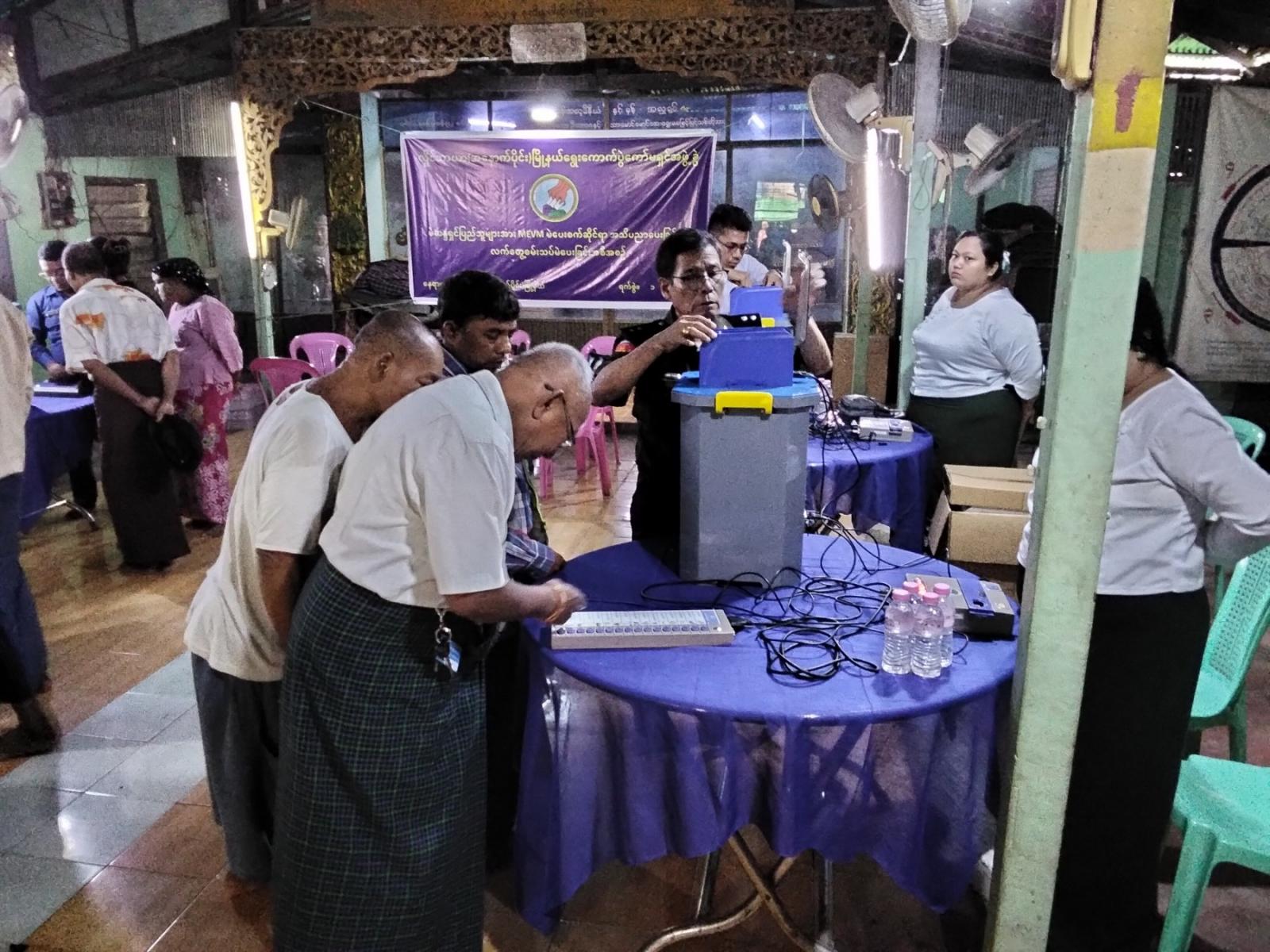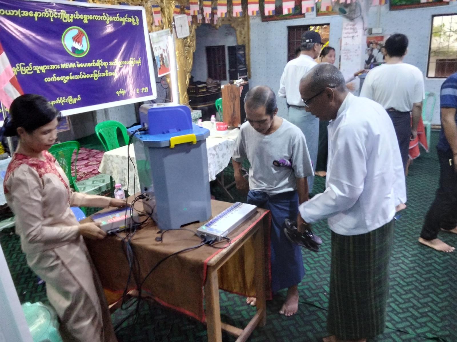 အဆိုပါကွင်းဆင်းဆောင်ရွက်ရာတွင် မြို့နယ်ရွေးကောက်ပွဲကော်မရှင်ဥက္ကဋ္ဌ ဦးသိန်းနိုင် မြို့နယ်ရွေးကောက်ပွဲကော်မရှင်အတွင်းရေးမှူး ဒေါ်သန်းသန်းဌေးတို့က MEVM မဲပေးစက်ဖြင့် လက်တွေ့အသုံးပြုပုံများကို ရှင်းလင်းပြောကြားပြီး ရပ်ကွက်နေပြည်သူများအား MEVM မဲပေးစက် လက်တွေ့စမ်းသပ်မဲပေးခြင်းလုပ်ငန်းများ ပြုလုပ်ခဲ့သည်။