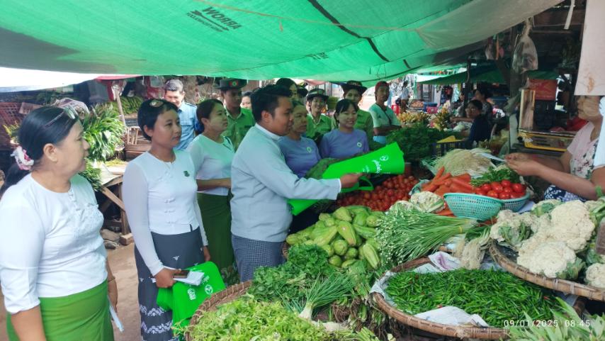 ထို့သို့ ဆောင်ရွက်ရာတွင် ကျောက်ဆည်ခရိုင်၊ ပတ်ဝန်းကျင်ထိန်းသိမ်းရေးဦးစီးဌာနမှ ဒုတိယဦးစီးမှူး ဦးမျိုးသီဟကျော်နှင့် ဝန်ထမ်းများ၊ စဉ့်ကိုင်မြို့နယ် အထွေထွေအုပ်ချုပ်ရေးဦးစီးဌာနမှ ဝန်ထမ်းများ၊ မြို့နယ်အမျိုးသမီးရေးရာအဖွဲ့ဝင်များ၊ မြို့နယ်မိခင်နှင့်ကလေးစောင့်ရှောက်ရေးအသင်းအဖွဲ့အဖွဲ့ဝင်များ၊ မြို့နယ်စည်ပင်သာယာရေးအဖွဲ့ဝင်များ ပူးပေါင်း၍ ဈေးရောင်း/ ဈေးဝယ်သူများအား ဈေးရောင်းရာတွင် ပလတ်စတစ်အိတ်များ အသုံးမပြု၍ ဈေးရောင်းဝယ်ခြင်း မပြုလုပ်ကြရန်၊ ပလတ်စတစ်အိတ်များ အသုံးပြုခြင်းအစား အင်ဖက်ရွက်များ အသုံးပြုကြရန် အသိပညာပေးဟောပြောခဲ့ကြပြီး၊ ဈေးဝယ်သူများအား Recycle Bag (၁၅၀) ပေးခြင်းနှင့် ပတ်ဝန်းကျင်သာယာလှပစေဖို့ ပလတ်စတစ်အမှိုက်ကင်းစေရေး ဆောင်ရွက်စို့ ခေါင်းစဉ်ပါ အသိပညာပေး လက်ကမ်းစာစောင်များကို (အခမဲ့) ဖြန့်ဝေပေးခဲ့ကြကြောင်း သိရသည်။