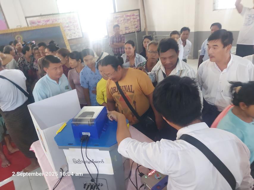 အလားတူ စိန်ပန်းရပ်ကွက် စိန်ပန်းအားကစားရုံ၌ကျင်းပရာ မြို့နယ်ရွေးကောက် ပွဲကော်မရှင်အဖွဲ့ခွဲ အတွင်းရေးမှူးက မဲပေးစက်ဆိုင်ရာ သိကောင်းစရာများကို ရှင်းလင်းပြောကြားပြီးနောက် တက်ရောက်လာသူများက မြန်မာအီလက်ထရောနစ်မဲပေးစက်ဖြင့် ကိုယ်တိုင်စမ်းသပ်မဲပေးခြင်းများကို လက်တွေ့ဆောင်ရွက်ခဲ့ကြသည်။