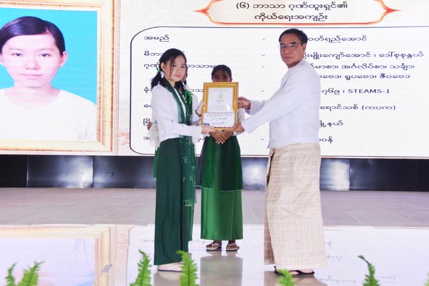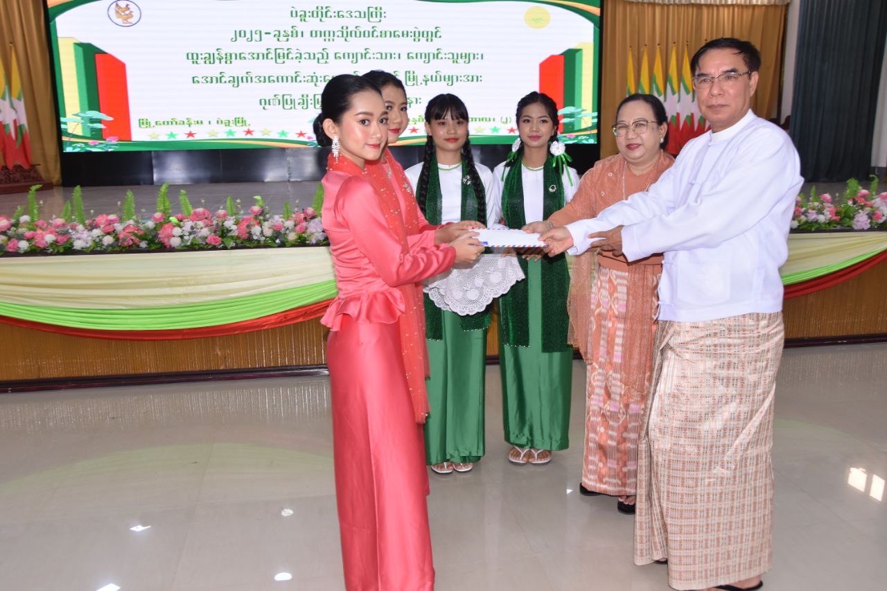 ယင်းနောက် လုံခြုံရေးနှင့်နယ်စပ်ရေးရာဝန်ကြီးက (၅)ဘာသာဂုဏ်ထူးရရှိသူ(၃)ဦးနှင့် အောင်ချက်အကောင်းဆုံးတတိယဆုရရှိသည့် သနပ်ပင်မြို့နယ်၊ အခြေ ခံပညာအထက်တန်းကျောင်းခွဲ (ညောင်လေးပင်မြို့နယ်)နှင့် လက်ရွေးစင်ကိုယ်ပိုင်ကျောင်း(အုတ်တွင်းမြို့နယ်)တို့အားလည်းကောင်း၊ အစိုးရအဖွဲ့ဝင်ဝန်ကြီးများ၊ အတွင်းရေးမှူးနှင့်ပဲခူးတိုင်းဒေသကြီးပညာရေးမှူးတို့က (၄)ဘာသာဂုဏ်ထူးရရှိသူ(၅၂)ဦးတို့အား ဂုဏ်ပြုလက်မှတ်နှင့်ဂုဏ်ပြုဆုငွေများကို အသီးသီး ချီးမြှင့်ပေးခဲ့ကြသည်။ ၎င်းနောက် အမှတ်(၂)အခြေခံပညာအထက်တန်းကျောင်းမှ ကျောင်းသား/ကျောင်းသူများက “ကောင်းခြင်းမင်္ဂလာ” သီချင်းဖြင့်လည်း ကောင်း၊ အမှတ်(၁)အခြေခံပညာအထက်တန်းကျောင်းမှ ကျောင်းသား/ကျောင်းသူများက "ပန်းဥယျာဉ်" သီးချင်းဖြင့်လည်းကောင်း၊ အ.ထ.က-မြို့အနောက် (ခ)ကျောင်းမှ ကျောင်းသား/ကျောင်းသူများက “ပန်းတိုင်း ပွင့်ပြီ မြန်မာပြည်” သီချင်းဖြင့်လည်းကောင်း၊ အသီးသီးဖျော်ဖြေတင်ဆက်ကြရာ ပဲခူးတိုင်းဒေသကြီးဝန်ကြီးချုပ်နှင့်ဇနီးတို့က ဂုဏ်ပြုဆုငွေများပေးအပ်ချီးမြှင့်ခဲ့ကြသည်။ ယင်းနောက် (၆)ဘာသာဂုဏ်ထူးရှင်ကျောင်းသူတစ်ဦးက ကျေးဇူးတင်ဂါရဝစကား ပြန် လည်ပြောကြားခဲ့ကာ တိုင်းဒေသကြီးဝန်ကြီးချုပ်နှင့် တာဝန်ရှိသူများက ထူးချွန်ဆုရကျောင်းသား/သူများ၊ ကျောင်းသားမိဘများအား ရင်းရင်းနှီးနှီးလိုက်လံနှုတ်ဆက်အားပေးစကားပြောကြားခဲ့ကြောင်း သတင်းရရှိသည်။