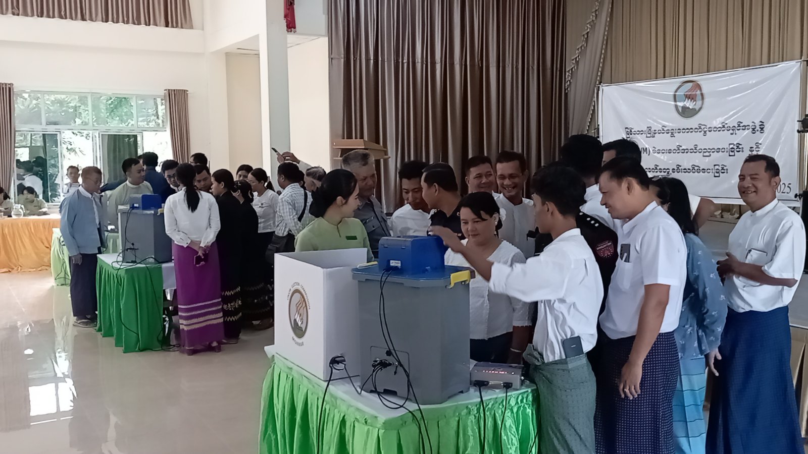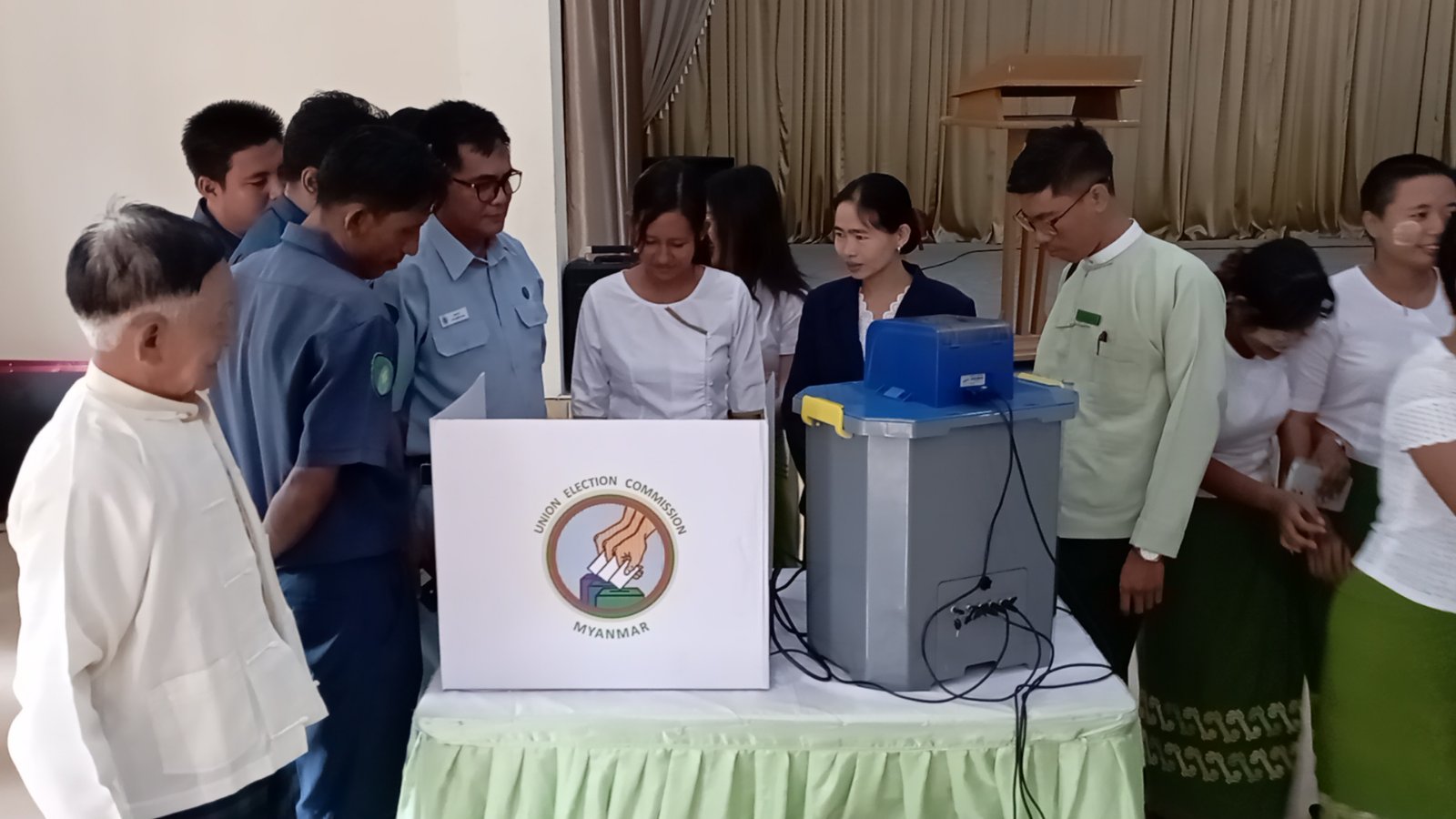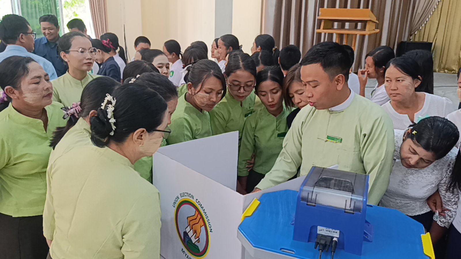 မြို့နယ်ရွေးကောက်ပွဲ ကော်မရှင်အဖွဲခွဲဥက္ကဋ္ဌ ဦးသန်းမောင်နှင့်အဖွဲ့ဝင်များက မဲပေးစက်ဖွဲ့စည်းတည်ဆောက်ပုံ၊ စက်တပ်ဆင်ပုံ၊ စမ်းသပ်မဲပေးပုံ၊ဖြန့်ခွဲပုံ၊ ရွေးကောက်ပွဲနေ့တွင် မဲရုံ၌မဲပေးစက်တပ်ဆင်ခင်းကျင်းပုံ ၊ မဲရလဒ်ရေတွက်ပုံ၊ နည်းဥပဒေပါအတိုင်း မဲရလဒ်စာရင်းပြုစုပုံ၊ မဲပေးစက်အား ပြန်လည်ထုပ်ပိုးသိမ်းဆည်းပုံနှင့် မဲရုံခင်းကျင်းမှုပုံစံများကို ဌာနဆိုင်ရာဝန်ထမ်းများအား လက်တွေ့စမ်းသပ်မဲပေးခြင်းသရုပ်ပြသခဲ့သည်။