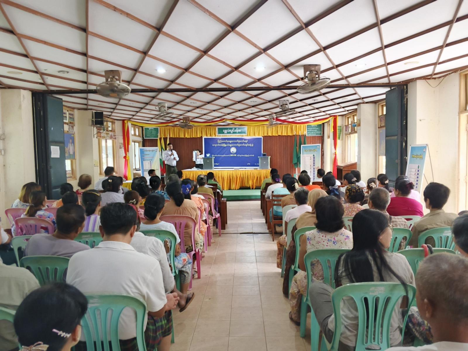 ဆက်လက်၍ မြို့နယ်ရွေးကောက်ပွဲအရာရှိနှင့် သင်တန်းနည်းပြများဦးဆောင်၍ မဲဆန္ဒရှင်ပြည်သူများအား မြန်မာအီလက်ထရောနစ်မဲပေးစက် (MEVM) ဖြင့် လက်တွေ့စမ်းသပ်မဲပေးခြင်းများကို ဆောင်ရွက်ခဲ့ကြရာ မဲဆန္ဒရှင်ပြည်သူများက စိတ်ပါဝင်စားစွာဖြင့် စမ်းသပ်မဲပေးခြင်းများ ဆောင်ရွက်ခဲ့ကြောင်း သိရသည်။