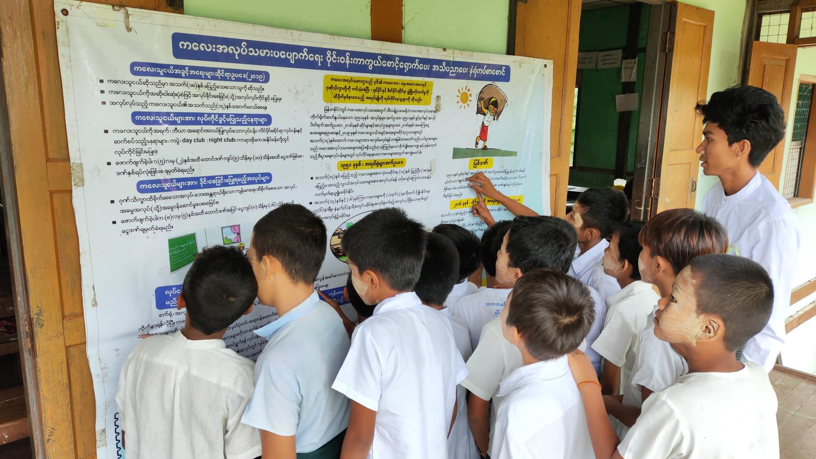 ထို့နောက် ကျောင်းသား၊ ကျောင်းသူများအား ရုပ်ပြပုံပြင်များပြောခြင်း၊ ကိုယ်ကာယလှုပ်ရှားမှု Activity လုပ်ငန်းစဥ်များလိုက်ပါဆောင်ရွက်စေခြင်းများ၊ နယ်လှည့်စာကြည့်တိုက်မှ စာအုပ်၊ စာစောင်များဖတ်ရှုစေခြင်းများပြုလုပ်ခဲ့ပြီး ပြန်ကြားရေးနှင့်ပြည်သူ့ဆက်ဆံရေးဦးစီးဌာနမှခင်းကျင်းပြသထားသည့် ကလေးအလုပ် သမားပပျောက်ရေး နံရံကပ်စာစောင်များကို စိတ်ပါဝင်စားစွာလေ့လာကြည့်ရှုခဲ့ကြောင်းသိရသည်။