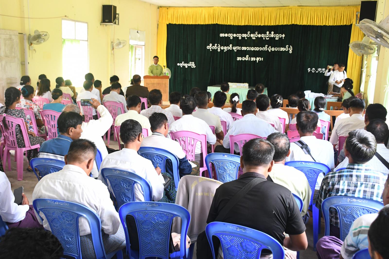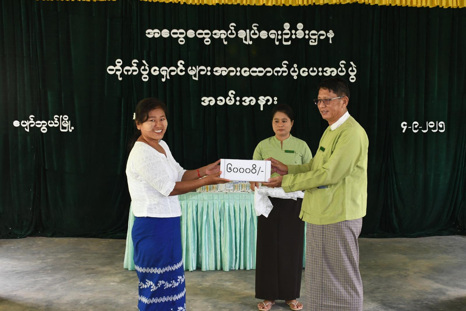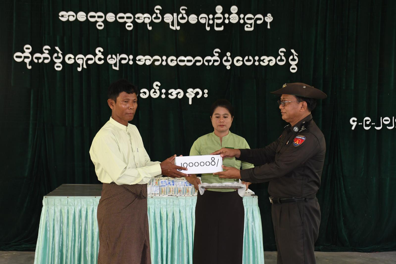 ဦးစွာ မြို့နယ်စီမံခန့်ခွဲရေးနှင့်အုပ်ချုပ်ရေးကော်မတီဥက္ကဋ္ဌ ဦးအာကာစိုး က နိုင်ငံတော်အနေဖြင့် ယာယီ နေရပ်စွန့်ခွာတိမ်းရှောင်လာသူများအတွက် ကူညီဆောင်ရွက်ပေးနေမှုအခြေအနေများကို ရှင်းလင်းဆွေးသည်။ ဆက်လက်၍ အမျိုသားသဘာဝဘေးအန္တရာယ်ဆိုင်ရာစီမံခန့်ခွဲမှုကော်မတီမှပေးအပ်သည့် ယာယီနေရပ်စွန့်ခွာပြည်သူ (၁၉၆၇)ဦးအတွက် တစ်ဦးလျှင် ဧပြီလ၊ မေနှင့်ဇွန်လအတွက် သုံးလစာ ငွေကျပ် (၆၀၀၀၀)နှုန်းကို ခရိုင်စီမံအုပ်ချုပ်ရေးအဖွဲ့ဥက္ကဋ္ဌ ဦးစိန်မြင့်နှင့်တာဝန်ရှိသူများက ထပ်ဆင့်ပေးအပ်ရာ သက်ဆိုင်ရာပြည်သူများက လက်ခံယူခဲ့ကြောင်း သိရသည်။
