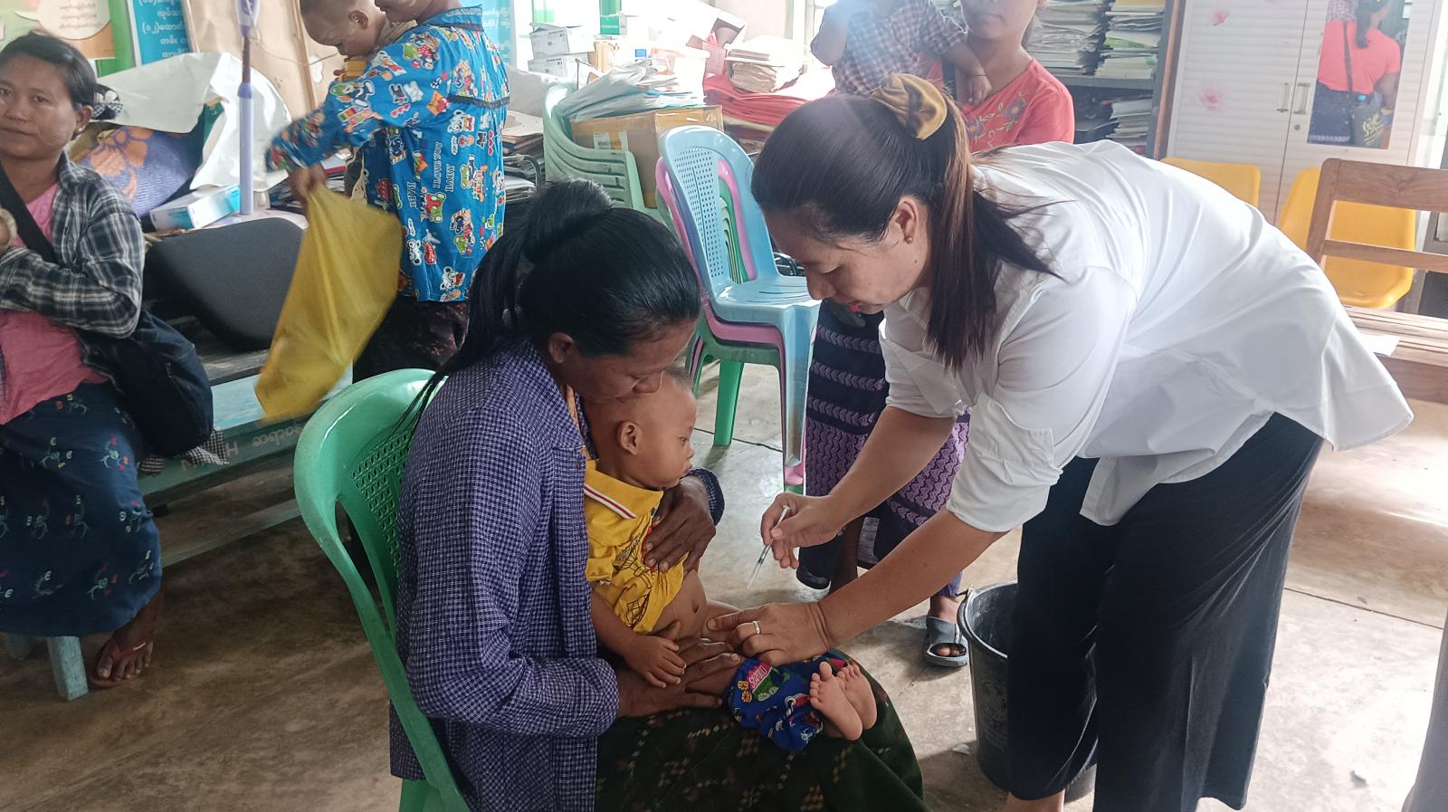 မြို့နယ်မိခင်နှင့်ကလေးကျန်းမာရေးဌာနမှ ကျန်းမာရေးဆရာမများနှင့်သားဖွားဆရာမတို့က ကိုယ်ဝန်ဆောင်မိခင်များနှင့်မွေးကင်းစမှ တစ်နှစ်ခွဲအောက် ကလေးငယ်များအား လစဉ် သတ်မှတ်ရက်များတွင် ကာကွယ်ဆေးများကို ဆက်လက်ထိုးနှံတိုက်ကျွေး ပေးသွားမည်ဖြစ် ကြောင်း မြို့နယ်မိခင်နှင့်ကလေးကျန်းမာရေးဌာန တာဝန်ရှိသူတစ်ဦးထံမှသိရသည်။