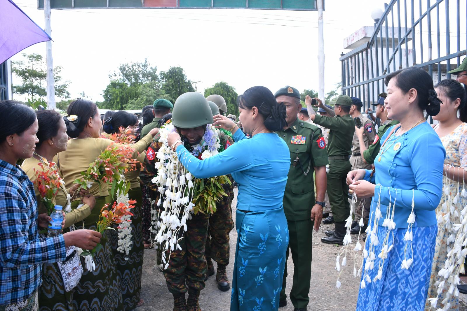 အဆိုပါရှေ့တန်းပြန်တပ်မတော်သားများကို နေပြည်တော်တိုင်းစစ်ဌာနချုပ်မှ တိုင်းမှူး ဗိုလ်ချုပ်စိုးမင်း၊ တပ်ကုန်းတပ်နယ်မှူးနှင့် စစ်ဘက်ဆိုင်ရာတာဝန်ရှိသူများ၊ ခမရ (၁၀၉) မှ အရာရှိ၊ အရာခံ၊ စစ်သည်၊ မိသားစုဝင်များ၊ မြို့နယ်စီမံခန့်ခွဲရေးနှင့်အုပ်ချုပ်ရေးကော်မတီအဖွဲ့ဝင် ဗိုလ်မှူးဝင်းထွဋ်အောင်နှင့် မြို့နယ်အဆင့်ဌာနဆိုင်ရာဝန်ထမ်းများ၊ မြို့နယ်ရဲတပ်ဖွဲ့ဝင်များ၊ မြို့နယ်အမျိုးသမီးရေးရာအဖွဲ့ဝင်များ၊ မြို့နယ်မိခင်နှင့်ကလေးစောင့်ရှောက်ရေးအသင်းဝင်များ၊ မြို့မ ခြောက်ရပ်ကွက်မှ ရပ်ကွက်အုပ်ချုပ်ရေးများနှင့်ရပ်ကွက်ပြည်သူများ၊ မြို့နယ်စစ်မှုထမ်းဟောင်းအဖွဲ့ဝင်များ၊ ဆရာ၊ ဆရာမများနှင့် ကျောင်းသား၊ ကျောင်းသူများ စုစုပေါင်းဆိုကြိုသူဦးရေ ၉၀၀ ကျော်တို့က အောင်သပြေပန်း၊ အောင်စံပယ်ပန်းကုံး၊ အောင်ငွေပန်းကုံးနှင့် အောင်ပွဲဆင် ဘောက်စက်ကြီးများ၊ အိုးစည်၊ ဒိုးပတ်များဖြင့် ကြိုဆိုခဲ့ကြောင်း သိရသည်။