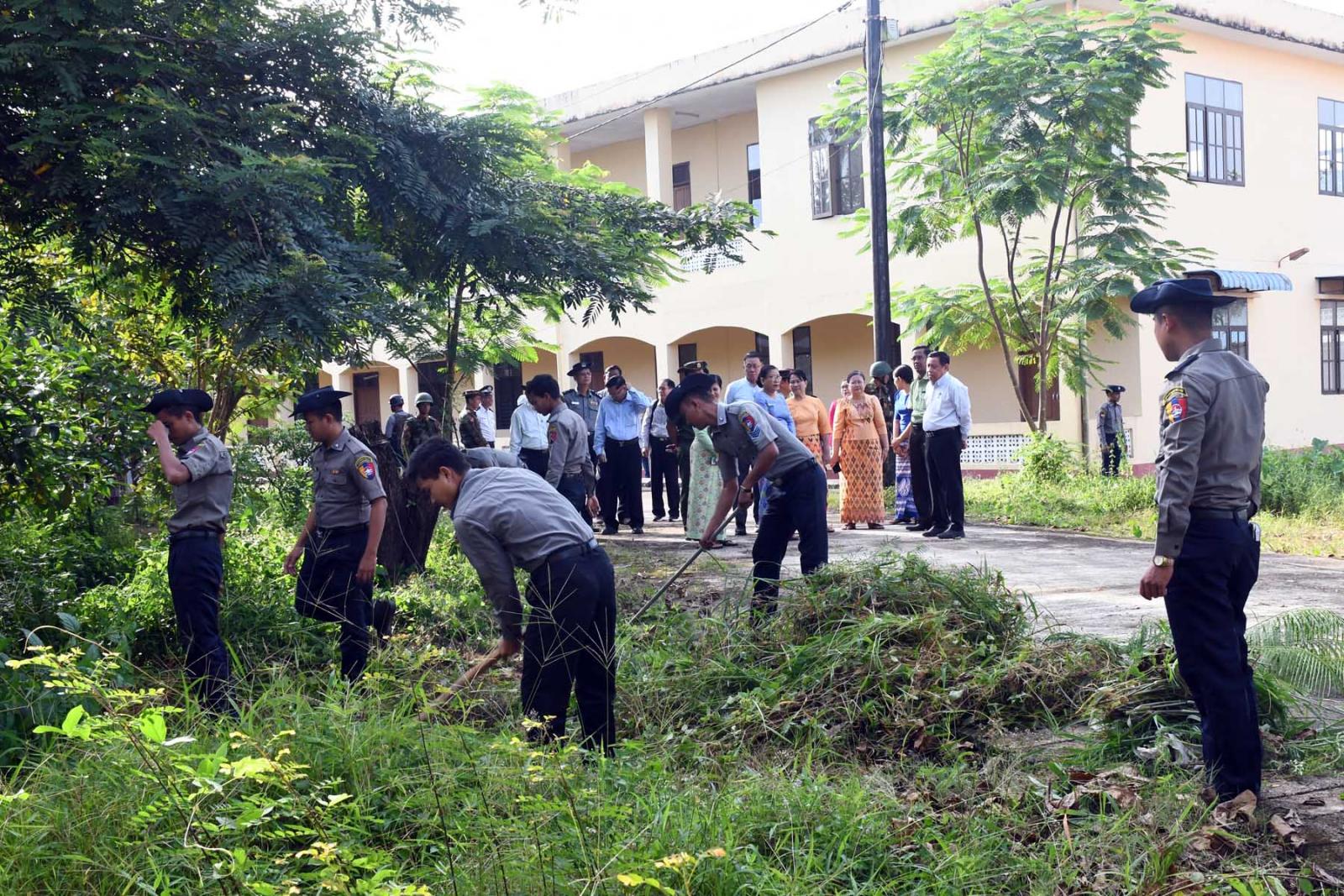 ဦးစွာတိုင်းဒေသကြီးဝန်ကြီးချုပ်နှင့်တာဝန်ရှိသူများက ထားဝယ်သူနာပြုသင်တန်းကျောင်းဝင်းအတွင်း စုပေါင်းသန့်ရှင်းရေး လုပ်ငန်းများ ဆောင်ရွက်နေမှုကိုလှည့်လည်၍ ကြည့်ရှုအားပေးပြီး သူနာပြုသင်တန်းသား/သူများ အတွက်ချက်ပြုတ်နေသည့်နေရာတွင် ထင်းအစားထိုးလောင်စာတုံး အသုံးပြုနိုင်ရန်နှင့် စားကြက်ဥများ ပေးအပ်ရာ သူနာပြုသင်တန်းကျောင်းအုပ် ဒေါ်သင်းသင်းလှိုင်က လက်ခံယူသည်။