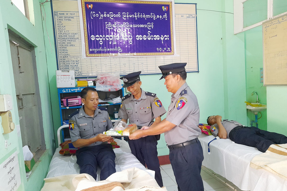 (၆၁)နှစ်မြောက် မြန်မာနိုင်ငံရဲတပ်ဖွဲ့နေ့ကို ကြိုဆိုဂုဏ်ပြုသောအားဖြင့်၊ မန္တလေးတိုင်းဒေသကြီး၊ ညောင်ဦးခရိုင် ကျောက်ပန်းတောင်းမြို့နယ် ရဲတပ်ဖွဲ့ဝင်များ စုပေါင်းသွေးလှူဒါန်းပွဲကို ယနေ့နံနက် ၁၁ နာရီခွဲက မြို့နယ်ပြည်သူ့ဆေးရုံကြီး၊ ဓာတ်ခွဲခန်းအဆောင်တွင် ပြုလုပ်ခဲ့သည်။