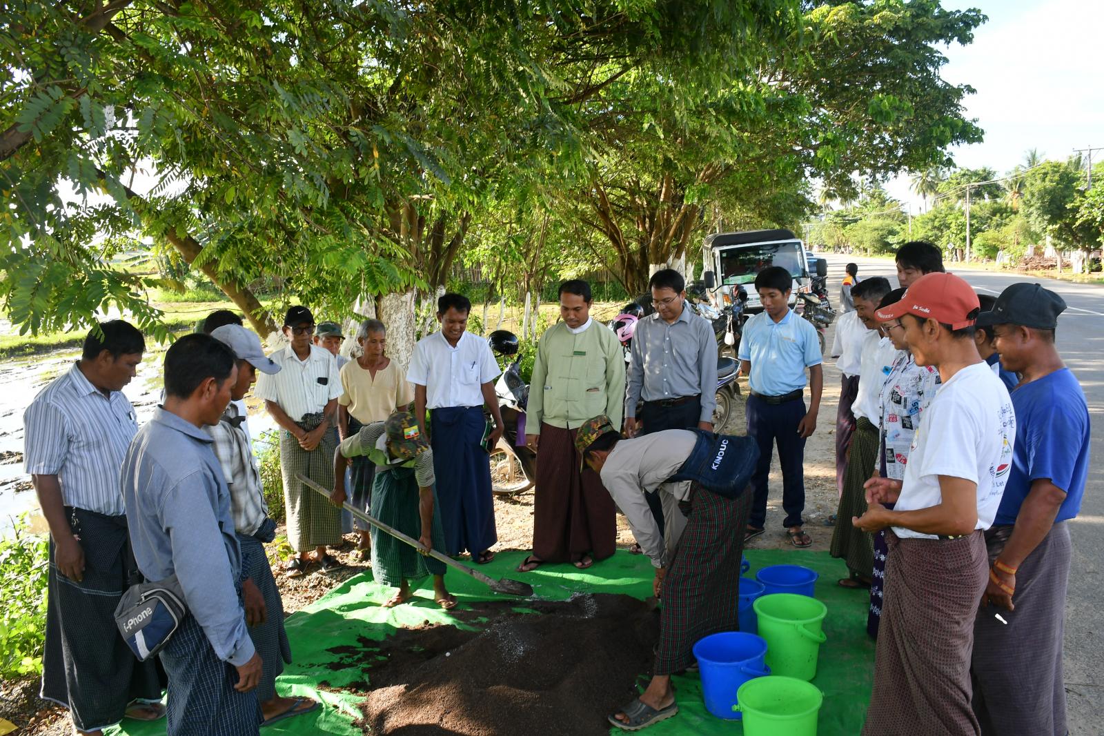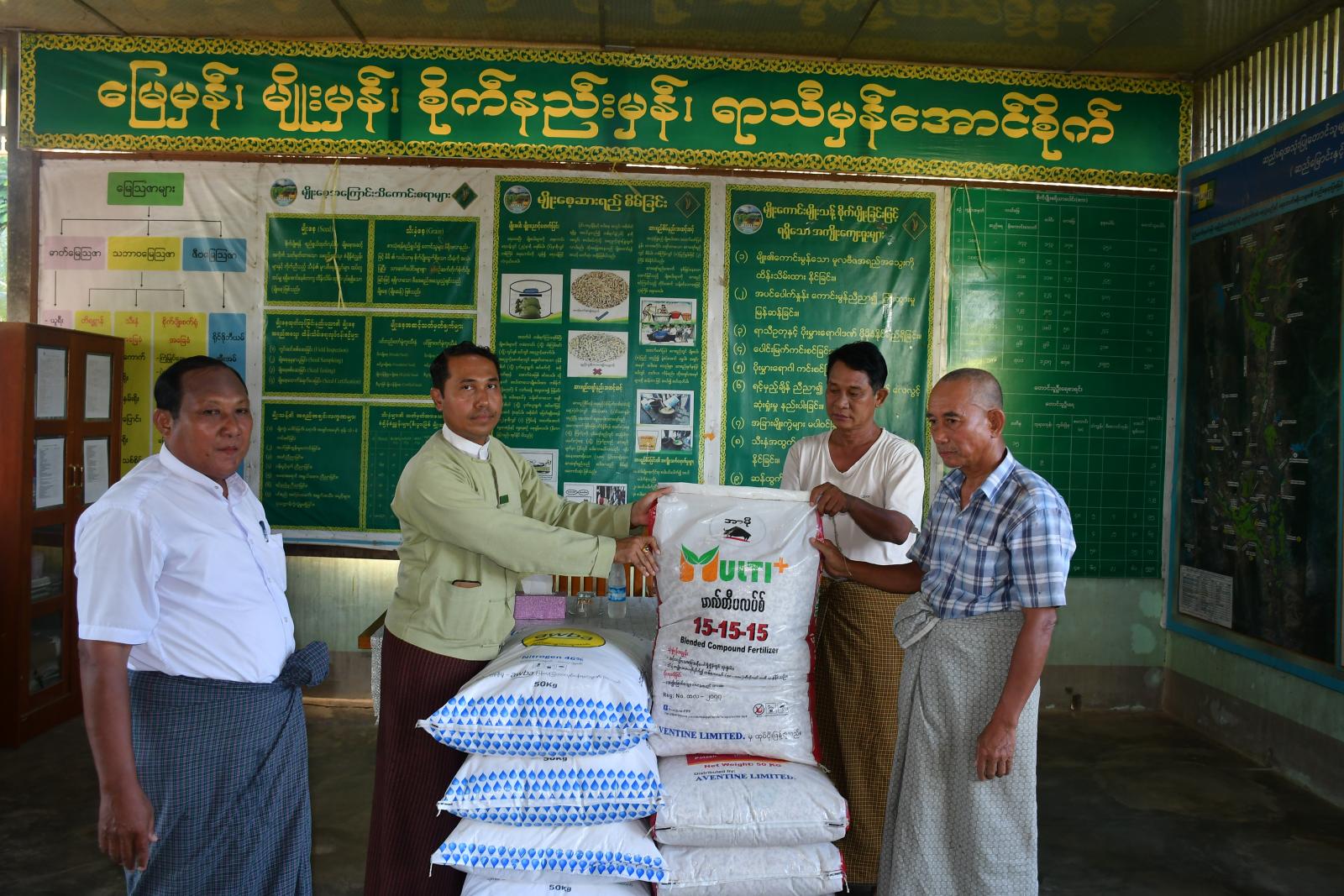 ယင်းနောက် မြို့နယ်စီမံခန့်ခွဲရေးနှင့် အုပ်ချုပ်ချုပ်ရေးကော်မတီဥက္ကဋ္ဌနှင့် တာဝန်ရှိသူများက တောင်သူများထံ သီးနှံပေါ်ပေးစနစ်ဖြင့် ဓာတ်မြေဩဇာသွင်းအားစုများ ပေးအပ်ခဲ့ကြောင်း သိရသည်။