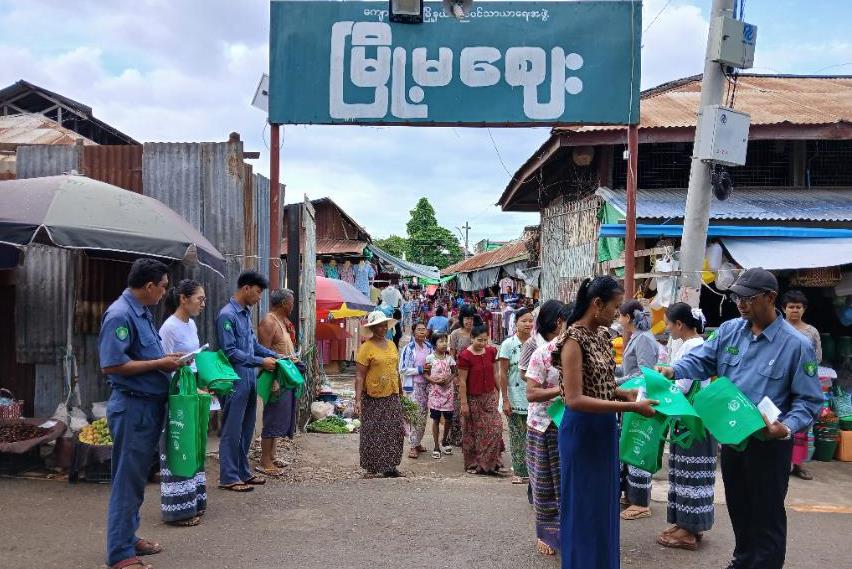 အသိပညာပေးလုပ်ငန်းများ ဆောင်ရွက်ရာ၌ မြို့နယ်အထွေထွေအုပ်ရေးဦးစီးဌာန၊ ခရိုင်ပတ်ဝန်းကျင် ထိန်းသိမ်းရေးဦးစီးဌာန၊ မြို့နယ်စည်ပင်သာယာရေးအဖွဲ့၊ ခရိုင်ပြန်ကြားရေးနှင့် ပြည်သူ့ဆက်ဆံရေးဦးစီးဌာနမှ တာဝန်ရှိသူများက ဈေးရောင်းချသူများနှင့် ဈေးဝယ်ပြည်သူများအား ကြွပ်ကြွပ်အိတ်၊ ပလတ်စတစ်အိတ်များအစား၊ ငှက်ပျောဖက်၊ အင်ဖက်၊ သတင်းစာစက္ကူစသည့် သင့်တော်ရာများနှင့်အစားထိုး ထုပ်ပိုးသုံးစွဲသွားကြစေရေး ရှင်းလင်းပြောကြားခဲ့ပြီး ပတ်ဝန်းကျင်သာယာလှပရေး၊ ပလတ်စတစ်အမှိုက်ကင်းစင်ရေး လိုက်နာဆောင်ရွက်သွားကြရန်အတွက် ပလတ်စတစ်၏ဆိုးကျိုးများဖြစ်သည့် မြို့ပြ၏သန့်ရှင်းသာယာလှပမှုကို ထိခိုက်ခြင်း၊ မြေထုကိုညစ်ညမ်းခြင်း၊ ရေထုကိုညစ်ညမ်းခြင်း၊ လေထုကိုညစ်ညမ်းခြင်း၊ ကျန်းမာရေးကို ထိခိုက်ခြင်း အကြောင်းများနှင့် ဖြေရှင်းရန် နည်းလမ်းများ၊ ပလတ်စတစ်အမျိုးအစားများအကြောင်း ပါဝင်သည့် အသိပညာပေးလက်ကမ်းစာစောင်များနှင့် ဈေးဝယ်ရာ၌ ရေရှည်ပြန်လည်အသုံးပြုနိုင်သည့်အိတ်များ ဖြန့်ဝေခဲ့ကြောင်း သိရသည်။