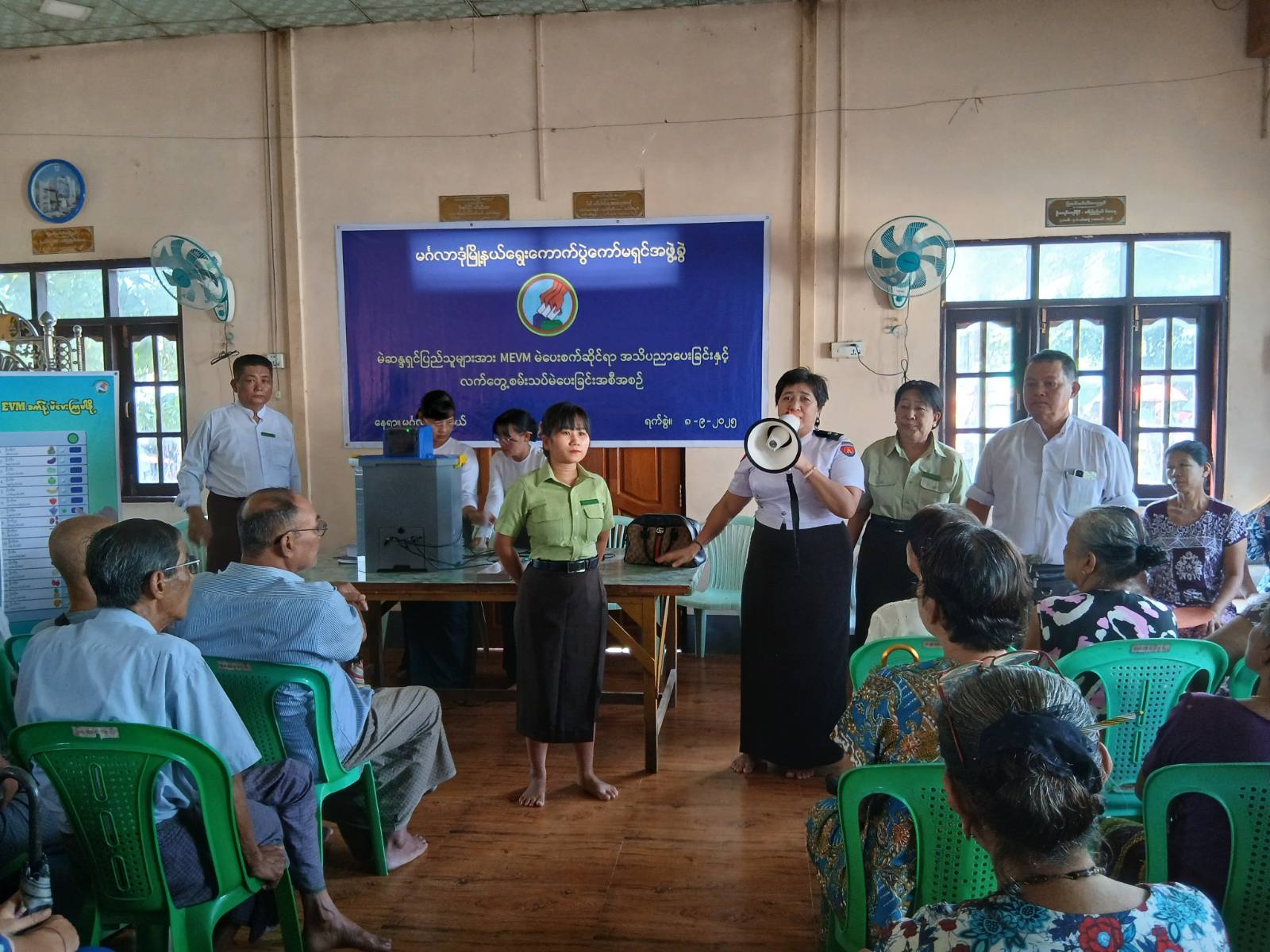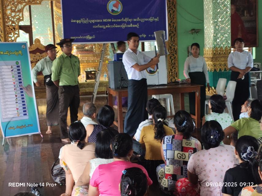 အဆိုပါသတ်မှတ်စုရပ်နေရာများဖြစ်သော တောတိုက်ဘုန်းကြီးကျောင်း၊ ပန်းခြံကုန်းဘုန်းကြီးကျောင်း၊ အောင်မင်္ဂလာဓမ္မာရုံ၊ ရပ်ကွက်ဓမ္မာရုံတို့၌ တောတိုက်ရပ်ကွက်မှ ပြည်သူ(၁၃၉၇)ဦး၊ ၂(ခ)ရပ်ကွက်မှ ပြည်သူ(၅၆၇)ဦး၊ ၃(က)ရပ်ကွက်မှ ပြည်သူ(၂၈၇)ဦး၊ ၃(ခ)ရပ်ကွက်မှ ပြည်သူ(၁၀၁၅)ဦးတို့အား မြို့နယ်ရွေးကောက်ပွဲကော်မရှင်အဖွဲ့ခွဲဥက္ကဋ္ဌနှင့် မြို့နယ်ရွေးကောက်ပွဲကော်မရှင်အဖွဲ့ခွဲ အတွင်းရေးမှူး တို့က ၂၀၂၅ ခုနှစ် ပါတီစုံဒီမိုကရေစီအထွေထွေရွေးကောက်ပွဲနှင့် ပတ်သက်၍ မဲဆန္ဒရှင်ပြည်သူများအနေဖြင့် မဲပေးကာလတွင် အခက်အခဲမရှိ မဲပေးနိုင်စေရန်ရည်ရွယ်လျက် မြန်မာအီလတ်ထရောနစ်မဲပေးစက်(MEVM)ဖြင့် လက်တွေ့အသုံးပြုပုံများ အဆင့်ဆင့်ကို အသိပညာပေးရှင်းလင်းပြောကြားခဲ့ပြီး ရပ်ကွက်နေပြည်သူများအား လက်တွေ့စမ်းသပ်မဲပေးခြင်း လုပ်ငန်းများကို ဆက်လက်ဆောင်ရွက်ပေးခဲ့ကြသည်။