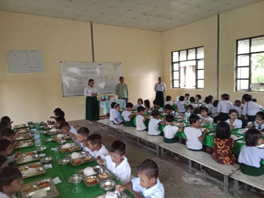ထိုသို့ ကျောင်းတွင်းအာဟာရကျွေးမွေးရာတွင် (KG) ကျောင်းသား/ ကျောင်းသူ (၄၅) ဦးတို့အား အစာအာဟာရ သုံးအုပ်စုတွင် ပါဝင်သော ထမင်း၊ ကြက်သားကြော်၊ အာလူးဟင်း၊ ပဲနီလေး (ဟင်းချို) နှင့် ပဲနို့တို့ကို နံနက်စာအဖြစ် ကျွေးမွေးခဲ့ရာ အဆိုပါကျွေးမွေးပွဲသို့ မြို့အုပ်ချုပ်ရေးမှူး၊ မြို့ပြည်သူ့ကျန်းမာရေးဦးစီးဌာန၊ ကျန်းမာရေးဝန်ထမ်းများနှင့် ဆရာ/ဆရာမများက လိုက်လံကြည့်ရှုခဲ့ကြသည်။