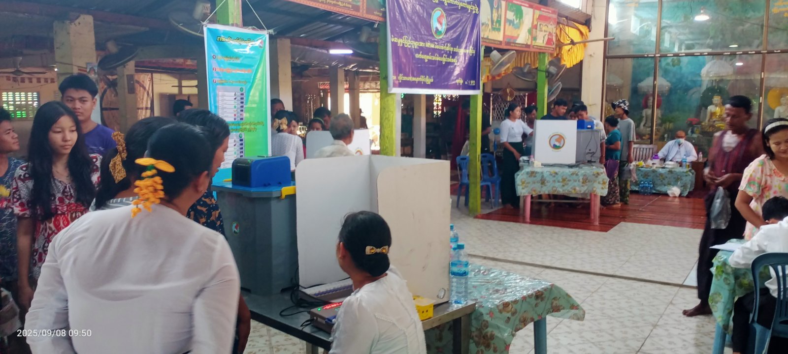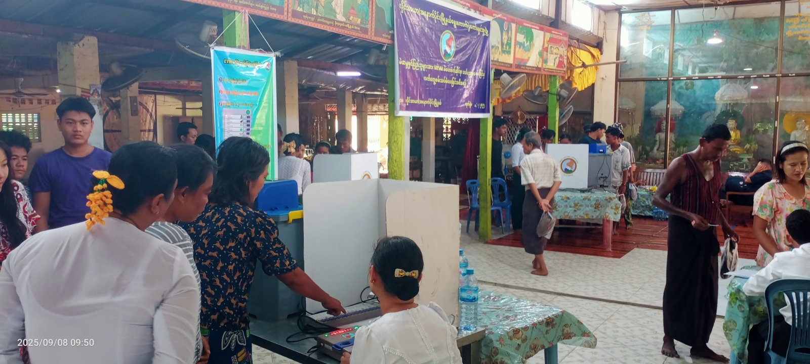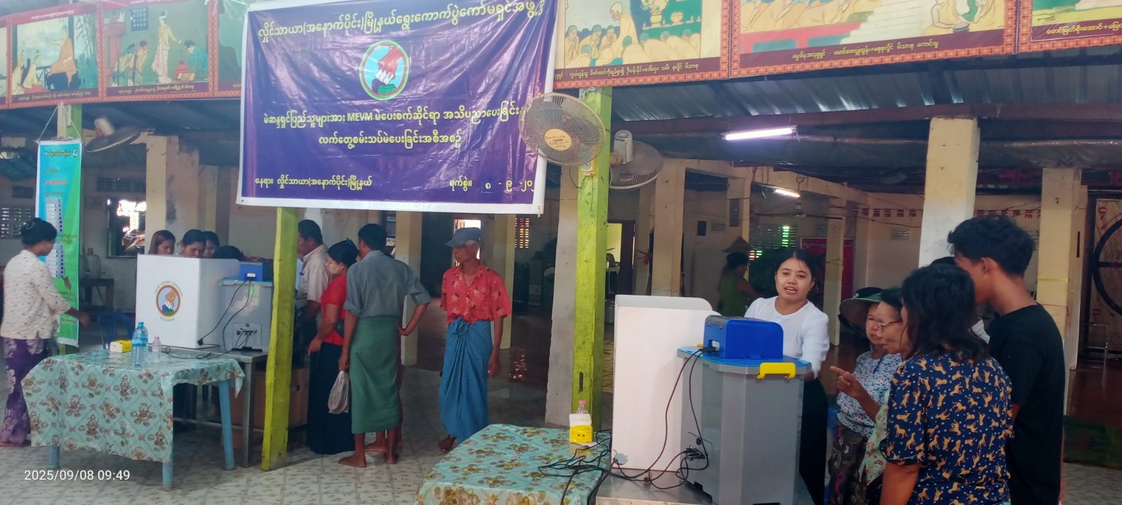 ရန်ကုန်တိုင်းဒေသကြီး အင်းစိန်ခရိုင် လှိုင်သာယာ (အနောက်ပိုင်း) မြို့နယ်တွင် မြို့နယ်စီမံခန့်ခွဲရေးနှင့် အုပ်ချုပ်ရေးကော်မတီနှင့် မြို့နယ်ရွေးကောက်ပွဲကော်မရှင်အဖွဲ့ခွဲတို့ ပူးပေါင်း၍ အမှတ် (၁၈) ရပ်ကွက် အေးရိပ်သာယာဓမ္မာရုံ၊ ပြည်လုံးချမ်းသာဓမ္မာရုံနှင့် မင်္ဂလာသီရိဓမ္မာရုံတို့၌ မဲဆန္ဒရှင်ပြည်သူများအား (MEVM) မဲပေးစက်ဆိုင်ရာ အသိပညာပေးခြင်းနှင့် လက်တွေ့စမ်းသပ်မဲပေးခြင်း အစီအစဥ်ကို ယမန်နေ့ နံနက် (၉) နာရီက ကွင်းဆင်းဆောင်ရွက်သည်။