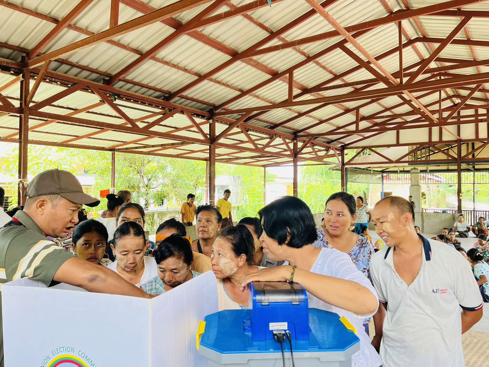 မန္တလေးတိုင်းဒေသကြီး အမရပူရခရိုင် အမရပူရမြို့နယ် တမုတ်ဆိုးကျေးရွာအုပ်စု ဂျိုကျေးရွာ ရွာဦးကျောင်းဓမ္မာရုံတွင် လာမည့်ရွေးကောက်ပွဲတွင်အသုံးပြုမည့် မြန်မာအီလက်ထရောနစ် မဲပေးစက် (MEVM) ကို စနစ်တကျကိုင်တွယ်မဲပေးတတ်စေရန် မြန်မာအီလက်ထရောနစ်မဲပေးစက်(MEVM) ဆိုင်ရာ အသိပညာပေး လက်တွေ့စမ်းသပ်မဲပေးခြင်းအခမ်းအနားကို ယနေ့နံနက် ၉ နာရီခွဲက အဆိုပါဓမ္မာရုံတွင်ကျင်းပသည်။