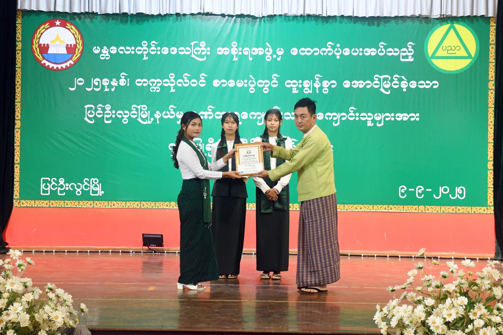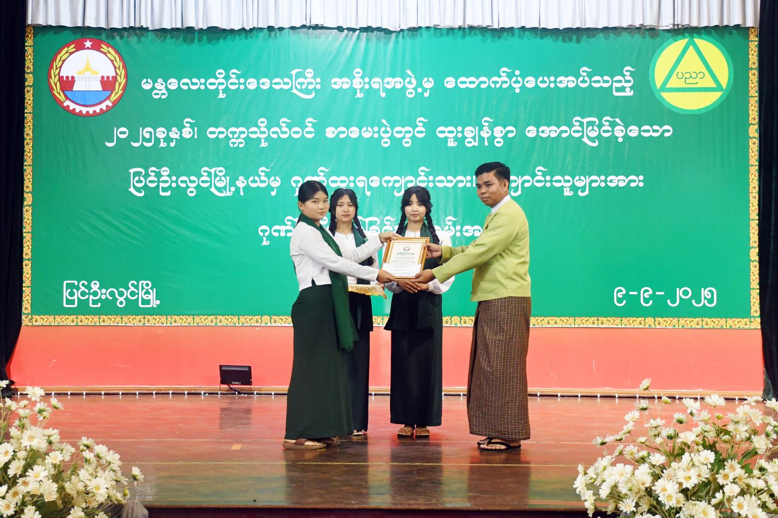 ဦးစွာ အမှတ်(၅) အခြေခံပညာအထက်တန်းကျောင်းမှ ကျောင်းသား၊ကျောင်းသူများက “ဘက်စုံပညာ ကိုရည် တို့လှမ်းချီ”သီချင်းသီဆိုဖွင့်လှစ်ပြီး ခရိုင်စီမံခန့်ခွဲရေးနှင့် အုပ်ချုပ်ရေးကော်မတီဥက္ကဋ္ဌ ဦးရဲထူးကအမှာစကားပြောကြားကာ တာဝန်ရှိသူများက ထူးချွန်ဂုဏ်ထူးရကျောင်းသား၊ ကျောင်းသူများအား ဂုဏ်ပြုဆုငွေနှင့်ဂုဏ်ပြုလွှာများ ပေးအပ်ချီးမြှင့်သည်။