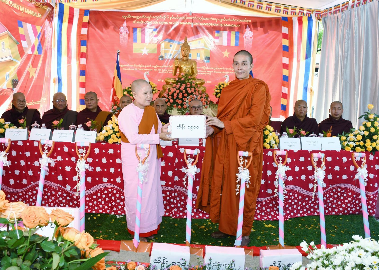 ၎င်းနောက် ဖားအောက်တောရ ဆရာတော်ဘုရားကြီးအား အမှူးထား၍ ဖားအောက်တောရ (ပြင်ဦးလွင်)ငလျင်ကူညီရေးအလှူရှင်များအဖွဲ့က ကျောင်းဆောင်တည်ဆောက်ရေးအတွက် အလှူတော်ငွေကျပ်သိန်း(၂၀၀၀)၊ ဗီယက်နမ်ဆရာတော် သဒ္ဓမ္မဇောတိကဓဇ ဦးဝိမလနှင့် ဗီယက်နမ်အလှူရှင်များက ပထမအကြိမ် အလှူတော်ငွေကျပ် သိန်း(၁၅၀၀)၊ဦးစိုင်းမောင်ထွန်း+ ဒေါ်နန်းမြစိန် အွန်ဟော်ကုမ္ပဏီ မိသားစုက အလှူတော်ငွေကျပ် သိန်း (၃၀၀)၊ ဦးချစ်စိန်+ ဒေါ်နန်းအေးထွေး (သား) ဝေယံလင်းထက်(ခ)ချန့်ချန့် AT- ဝေယံသိန်းကုမ္ပဏီ မိသားစုက အလှူတော်ငွေကျပ်သိန်း (၃၀၀) ကျပ်၊ ဒေါ်ခင်ခင်ရီ ရှိုင်းဟုပ်ကုမ္ပဏီက အလှူငွေကျပ် သိန်း(၁၀၀)၊ ကွယ်လွန်သူ (ဒေါ်နန်းနှင်းနီလာ)အား ရည်စူး၍ ဦးစိုင်းအိုက်အောင် မိသားစုက အလှူတော်ငွေကျပ် သိန်း(၅၀)ကျပ်၊ ဦးစိုင်းတင်သန်းဦး+ ဒေါ်နန်းအဲဆော (သမီး)ကိုစိုး+ မနန်းဆိုင်နွန်း (သား) စိုင်းကျော်ကျော်နိုင်မိသားစုက အလှူတော်ငွေကျပ်သိန်း(၅၀)၊ မန္တလေးမြို့၊ ကျွဲဆည်ကန်နေ မိခင်ကြီးဒေါ်အမာ အမှုးထား၍ ဦးစိုင်းအောင်မိန်း+ဒေါ်နန်းခမ်းအေး မိသားစု ONE STAR လယ်ယာသုံးပစ္စည်းအရောင်းဆိုင်က အလှုတော်ငွေ ကျပ်သိန်း(၅၀)တိုကို အသီးသီး ပေးအပ်လှူဒါန်းကြရာ သီလရှင်ဆရာလေး ဒေါ်ဓမ္မစာရီက လက်ခံရယူသည်။