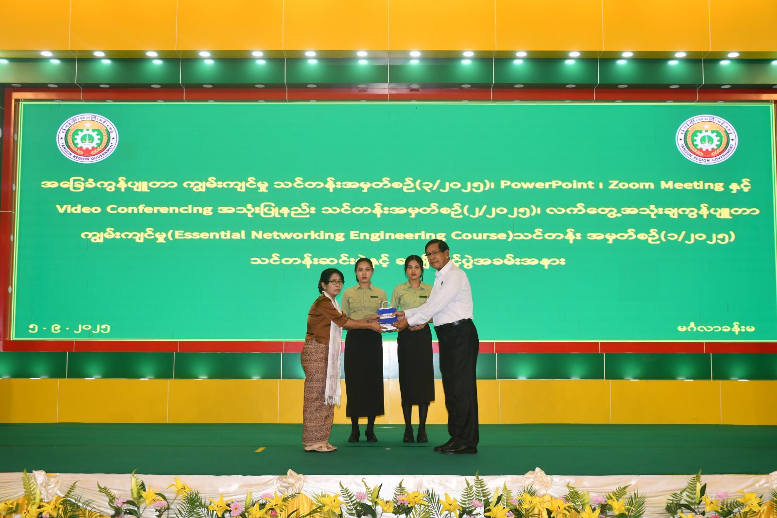 အခြေခံကွန်ပျူတာ ကျွမ်းကျင်မှုသင်တန်းအမှတ်စဉ်(၃/၂၀၂၅)၊ PowerPoint ၊ Zoom Meeting နှင့် Video Conferencing အသုံးပြုနည်းသင်တန်းအမှတ်စဉ်(၂/၂၀၂၅)၊ လက်တွေ့အသုံးချကွန်ပျူတာ ကျွန်းကျင်မှု (Essential Networking Engineering Course) သင်တန်းအမှတ်စဉ်(၁/၂၀၂၅) သင်တန်းဆင်းပွဲနှင့် ဆုချီးမြှင့်အခမ်းအနားကို စက်တင်ဘာ ၅ ရက်နေ့ နေ့လယ်ပိုင်းက ရန်ကုန်တိုင်းဒေသကြီး အစိုးရအဖွဲ့ရုံး၊ မင်္ဂလာခန်းမတွင် ကျင်းပရာ ရန်ကုန်တိုင်းဒေသကြီး ဝန်ကြီးချုပ် ဦးစိုးသိန်း၊ တိုင်းဒေသကြီး ဝန်ကြီးများ၊ သင်တန်းကြီးကြပ်များ၊ သင်တန်းနည်းပြ ဆရာ/ဆရာမများ၊ ဌာနဆိုင်ရာအသီးသီးမှ သင်တန်းသား၊ သင်တန်းသူများနှင့် တာဝန်ရှိသူများ တက်ရောက်ကြသည်။