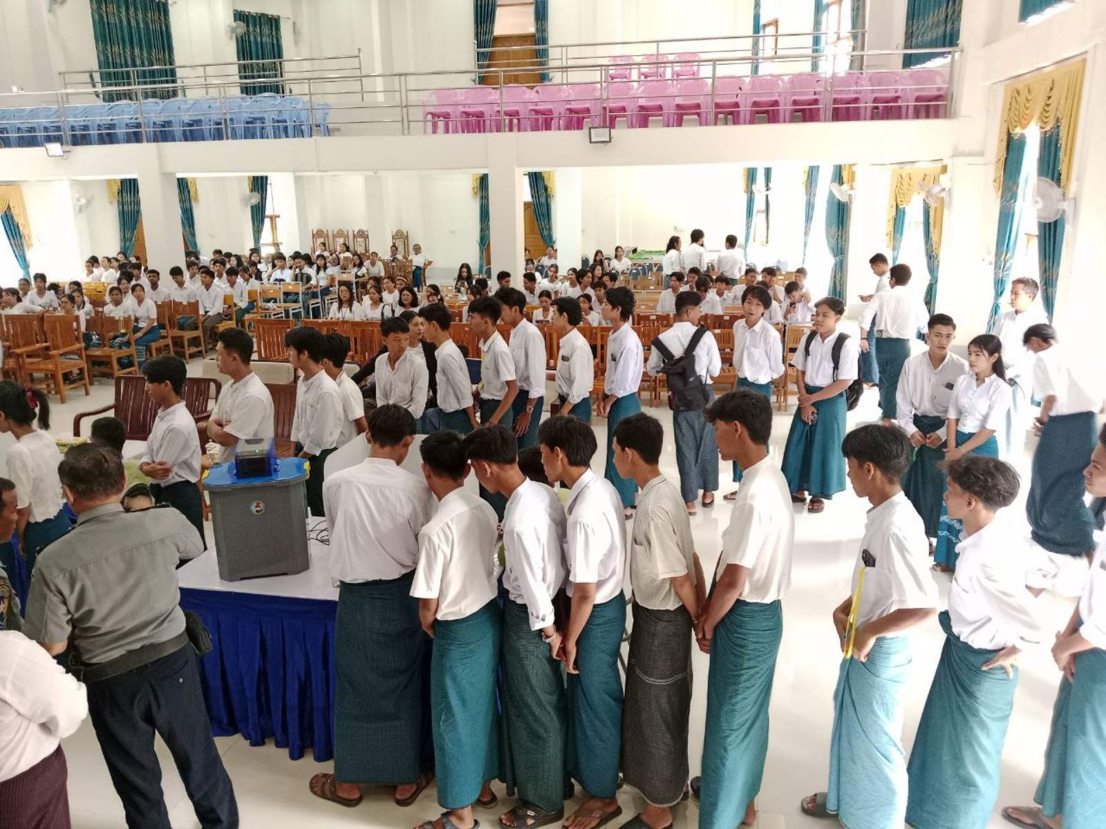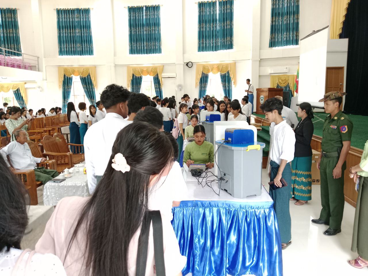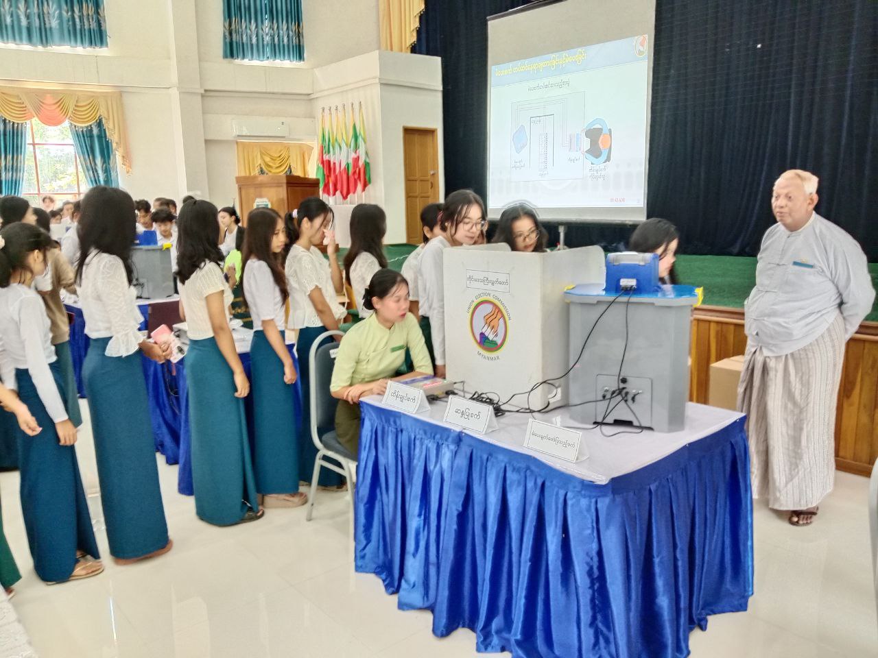ပဲခူးတိုင်းဒေသကြီး၊ ပြည်မြို့နယ် ရွေးကောက်ပွဲကော်မရှင်အဖွဲ့ခွဲမှ မြန်မာအီလက်ထရောနစ်မဲပေးစက်ဆိုင်ရာ အသိပညာပေးဆွေးနွေးပွဲနှင့် လက်တွေ့စမ်းသပ်မဲပေးခြင်းအခမ်းအနားကို ယမန်နေ့နံနက်ပိုင်းက ပြည်မြို့ရှိ ကွန်ပျူတာတက္ကသိုလ်(ပြည်)၌ဆောင်ရွက်ရာ ပြည်မြို့နယ်စီမံခန့်ခွဲရေးနှင့် အုပ်ချုပ်ရေးကော်မတီဝင်များ၊ ခရိုင်/မြို့နယ်ရွေးကောက်ပွဲကော်မရှင်အဖွဲ့ခွဲတာဝန်ရှိသူများ၊ ဌာနဆိုင်ရာများနှင့် ယင်းတက္ကသိုလ်မှတာဝန်ရှိများ၊ ဆရာ/ဆရာမများနှင့် ကျောင်းသား၊ ကျောင်းသူများတက်ရောက်ကြသည်။