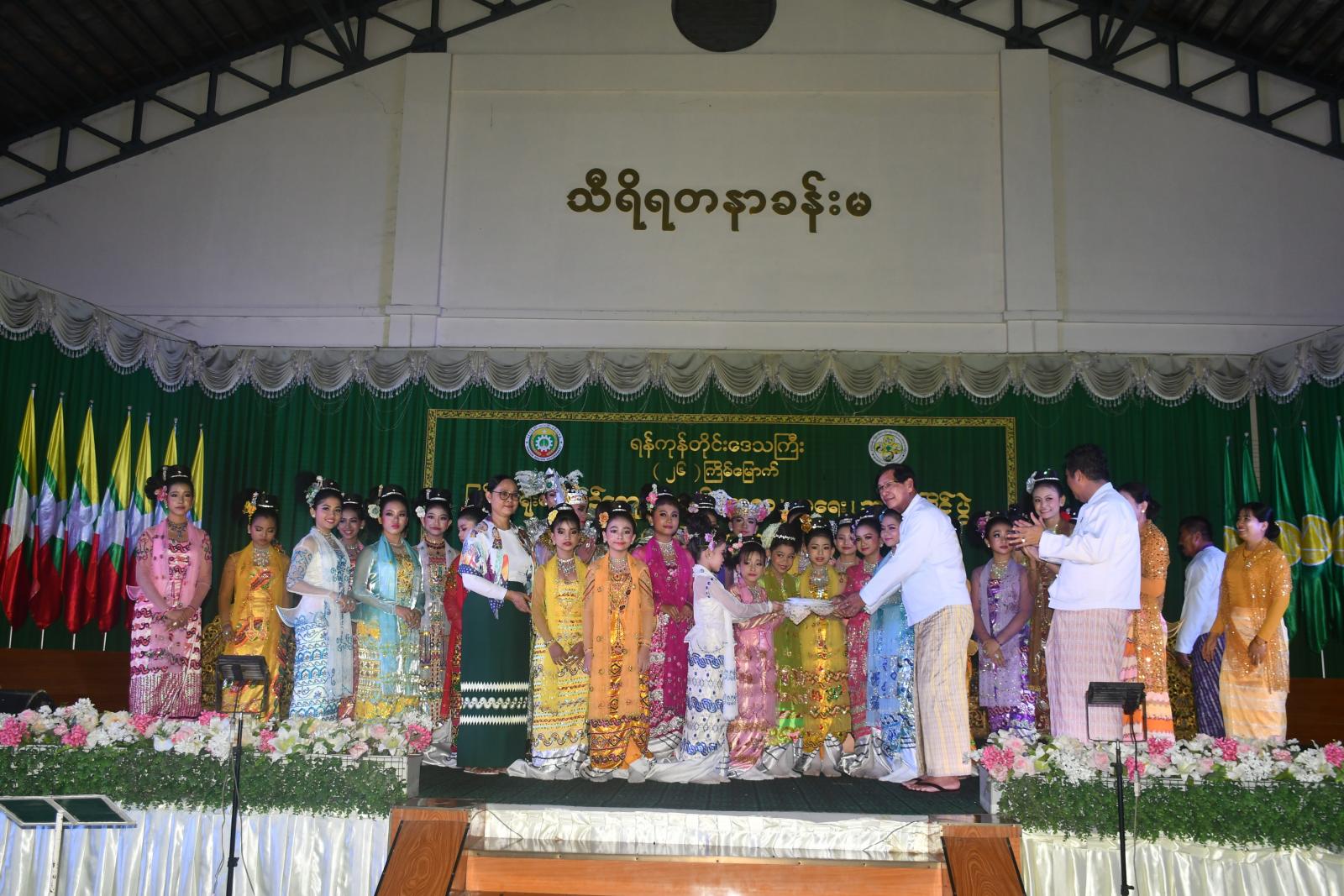 ဆက်လက်၍ လသာမြို့နယ်၊ အမှတ်(၂)အခြေခံပညာအထက်တန်းကျောင်းမှ ၁၀-၁၅ နှစ် ကျောင်းသူလေးများ၏ (ဆုဝတီ) ဆိုင်းအဖွဲ့က တီးခတ်ဖျော်ဖြေခြင်းဖြင့်လည်းကောင်း၊ ဒဂုံမြို့နယ်၊ အမှတ်(၁)အခြေခံပညာအထက်တန်းကျောင်းမှ ကျောင်းသား၊ ကျောင်းသူများက “လူချွန်လူကောင်း” သီချင်းဖြင့် တီးခတ်သီဆိုဖျော်ဖြေခြင်းဖြင့်လည်းကောင်း၊ ကြည့်မြင်တိုင်မြို့နယ်၊ အမှတ်(၃)အခြေခံပညာအထက်တန်းကျောင်းမှ ကျောင်းသား၊ ကျောင်းသူများက “သွေးချင်းတို့ရဲ့မြေ” သီချင်းဖြင့် ကပြဖျော်ဖြေခြင်းဖြင့်လည်းကောင်း၊ မြောက်ဥက္ကလာပမြို့နယ်၊ ပညာလင်္ကာရမဏ္ဍိုင်ဘုန်းတော်ကြီးသင်ပညာရေး မူလတန်းလွန်ကျောင်းမှ ကျောင်းသူလေးများက “မြန်မာ့စိတ်ရင်းမြန်မာ့ရှုခင်း” သီချင်းဖြင့် တီးခတ်သီဆိုဖျော်ဖြေခြင်းဖြင့်လည်းကောင်း တင်ဆက်ခဲ့ကြပြီး ရန်ကုန်တိုင်းဒေသကြီး ဝန်ကြီးချုပ် ဦးစိုးသိန်းနှင့် ဇနီး ဒေါ်မော်မော်သန်း၊ ရန်ကုန်တိုင်းစစ်ဌာနချုပ် တိုင်းမှူး ဗိုလ်ချုပ် ပြည့်စုံလင်းနှင့် ဇနီးတို့က ဖျော်ဖြေရေးအဖွဲ့များအား ဂုဏ်ပြုချီးမြှင့်ငွေများ ပေးအပ်ကြသည်။