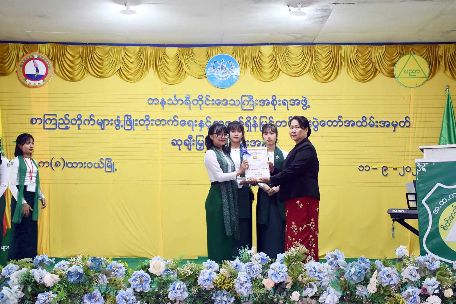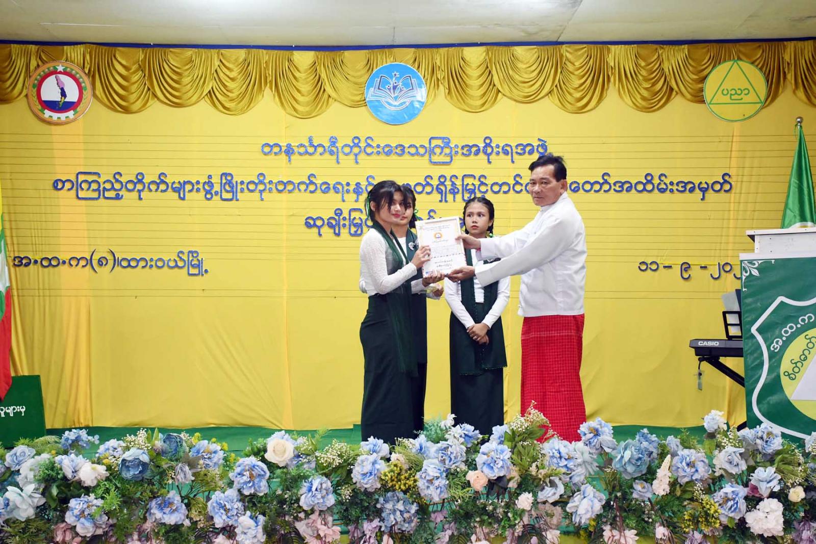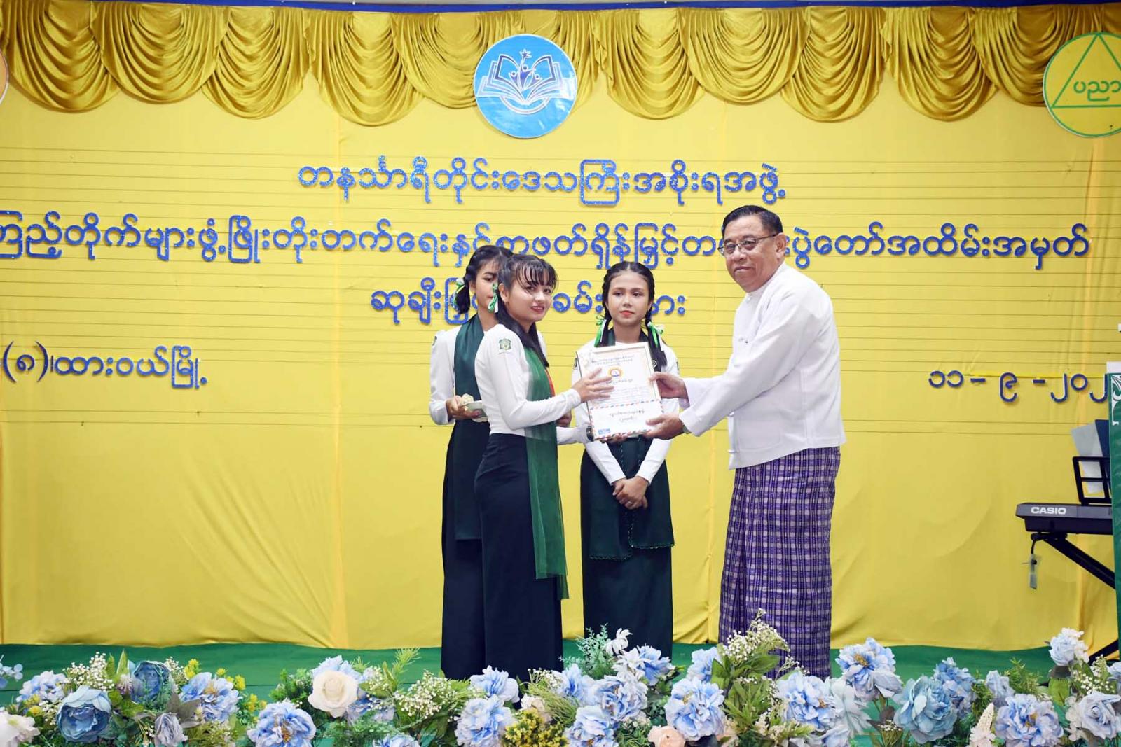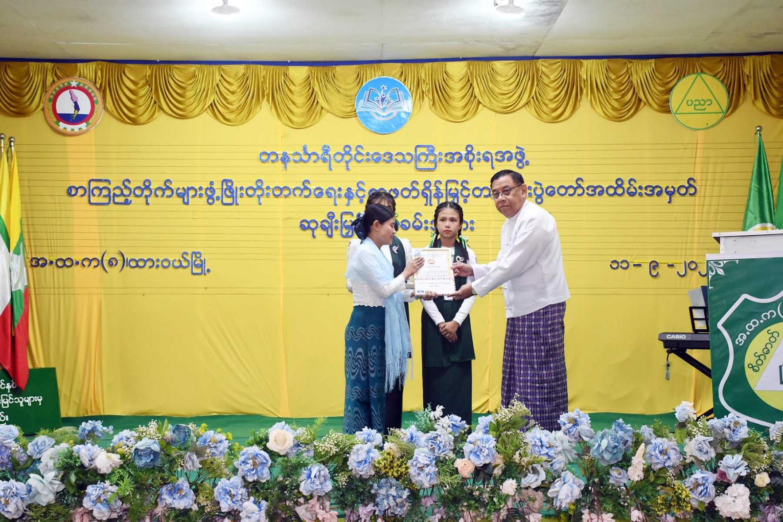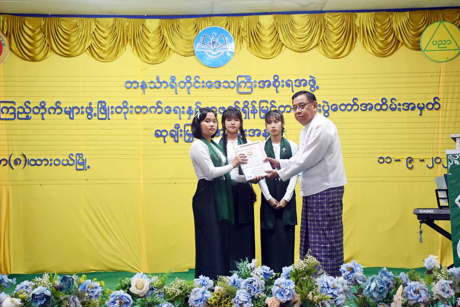 ထို့နောက် တိုင်းဒေသကြီးဝန်ကြီးချုပ်က လူငယ်စာပေဆွေးနွေးပေးသော ကျောင်းသားကျောင်းသူ (၄)ဦးနှင့် ကျပန်းစကားပြောပြိုင်ပွဲ (အထက်တန်း)အဆင့်တွင်ဆုရရှိသောကျောင်းသားကျောင်းသူ (၅)ဦးအားဆုချီးမြှင့်ကာ တိုင်းဒေသကြီးတရားလွှတ်တော်တရားသူကြီးချုပ် ဒေါ်ပိုက်ပိုက်အေးက စာစီစာကုံး (အထက်တန်း) အဆင့်တွင် ဆုရရှိသူ(၅)ဦးအား ဆုချီးမြှင့်သည်။