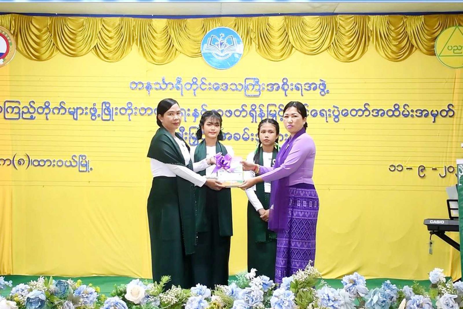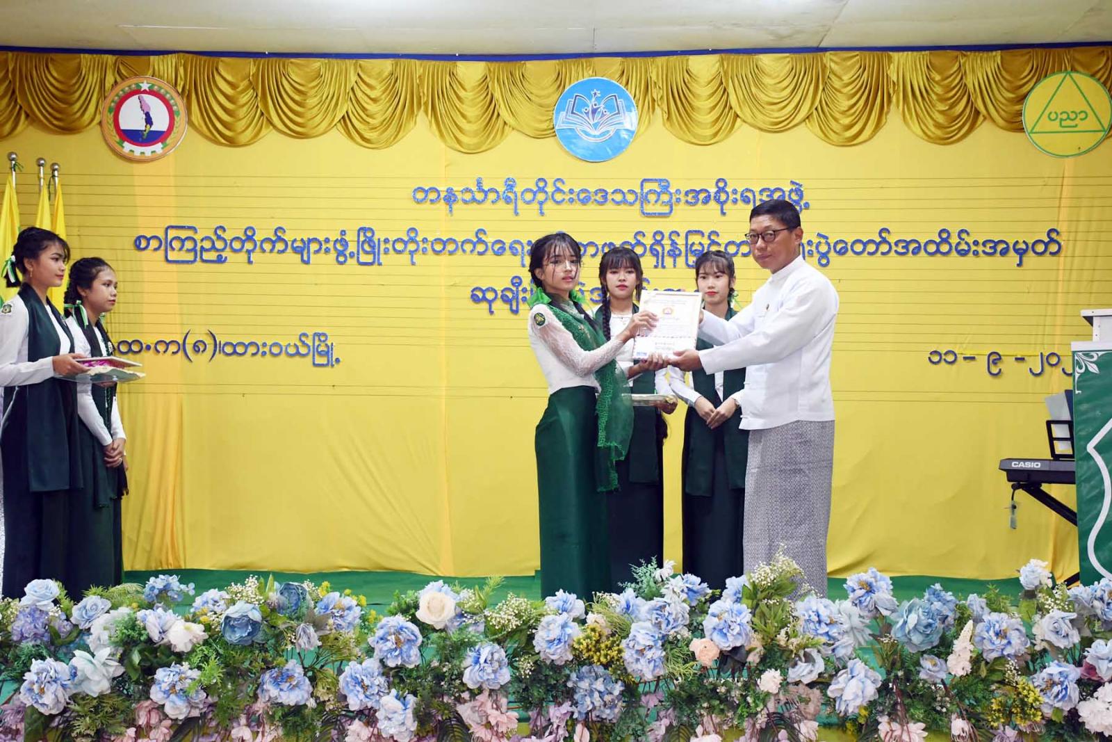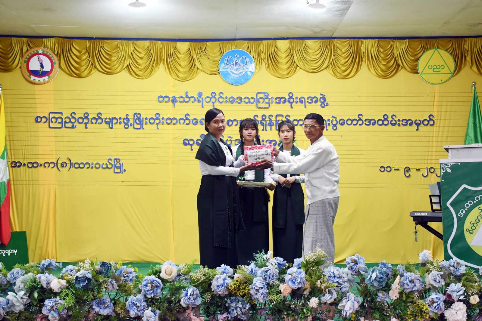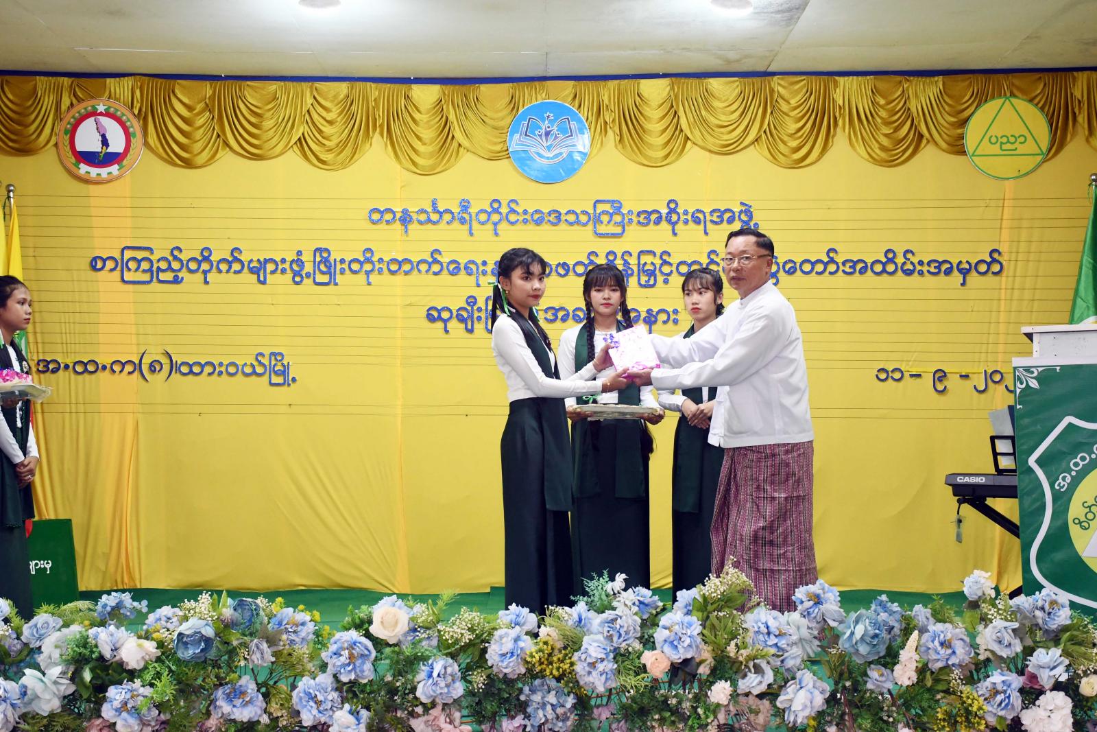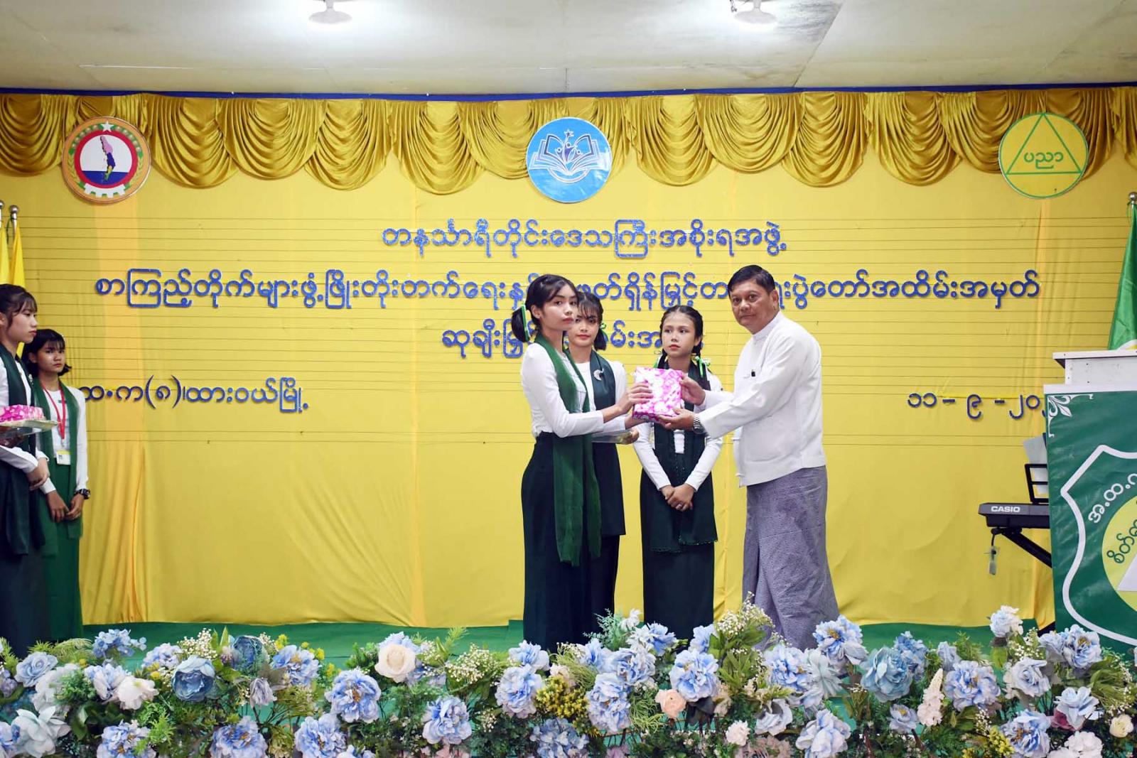 ထို့နောက် တိုင်းဒေသကြီးဝန်ကြီးချုပ်က လူငယ်စာပေဆွေးနွေးပေးသော ကျောင်းသားကျောင်းသူ (၄)ဦးနှင့် ကျပန်းစကားပြောပြိုင်ပွဲ (အထက်တန်း)အဆင့်တွင်ဆုရရှိသောကျောင်းသားကျောင်းသူ (၅)ဦးအားဆုချီးမြှင့်ကာ တိုင်းဒေသကြီးတရားလွှတ်တော်တရားသူကြီးချုပ် ဒေါ်ပိုက်ပိုက်အေးက စာစီစာကုံး (အထက်တန်း) အဆင့်တွင် ဆုရရှိသူ(၅)ဦးအား ဆုချီးမြှင့်သည်။
