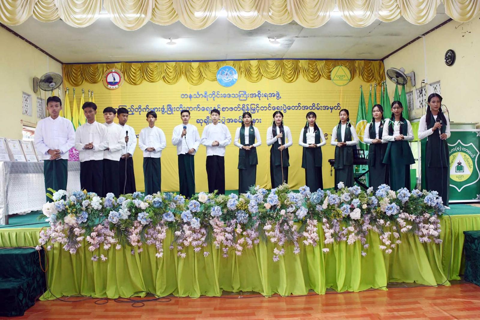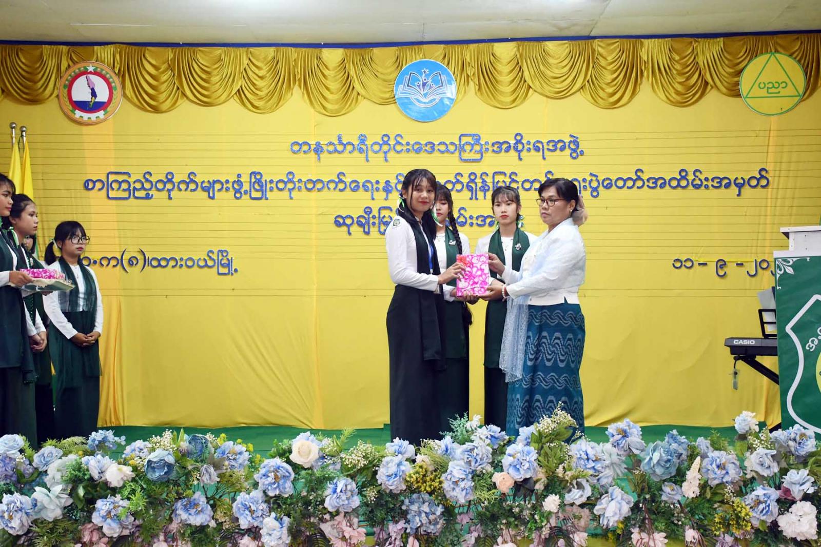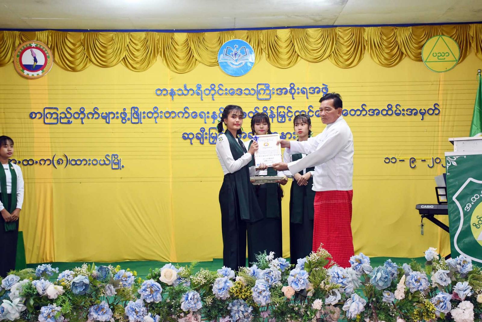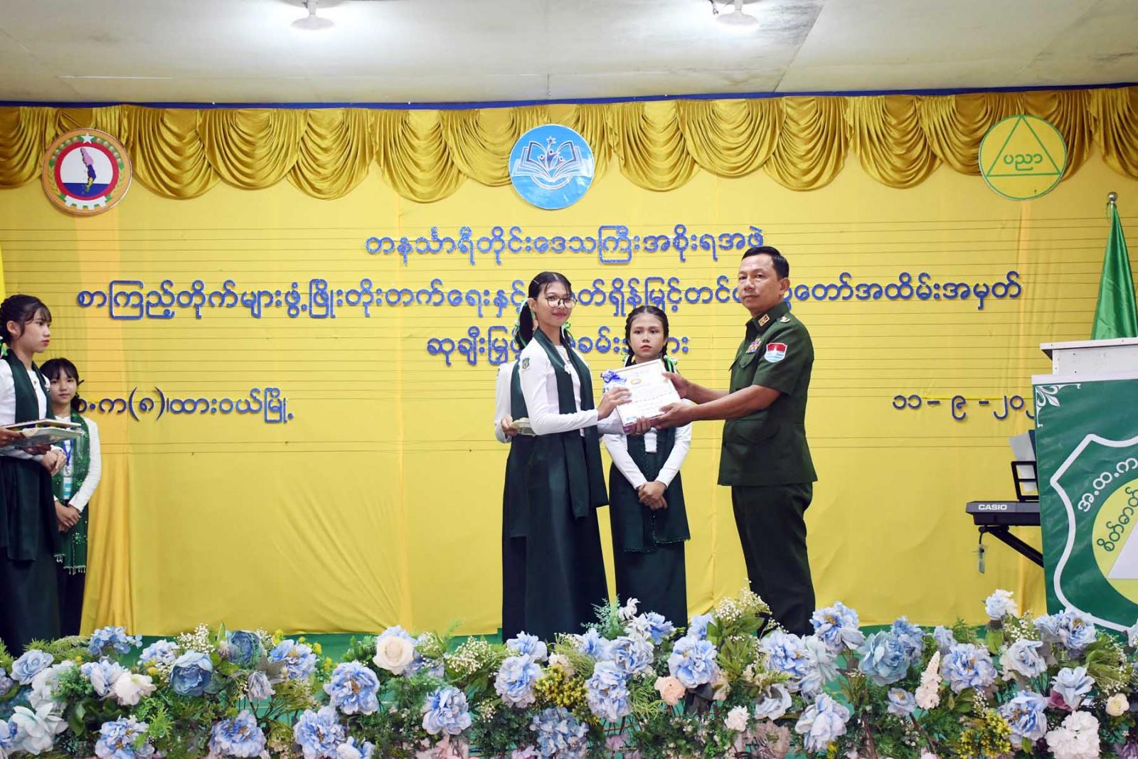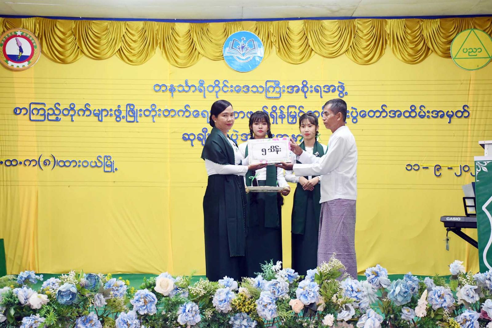 ထို့နောက် တိုင်းဒေသကြီးဝန်ကြီးချုပ်က လူငယ်စာပေဆွေးနွေးပေးသော ကျောင်းသားကျောင်းသူ (၄)ဦးနှင့် ကျပန်းစကားပြောပြိုင်ပွဲ (အထက်တန်း)အဆင့်တွင်ဆုရရှိသောကျောင်းသားကျောင်းသူ (၅)ဦးအားဆုချီးမြှင့်ကာ တိုင်းဒေသကြီးတရားလွှတ်တော်တရားသူကြီးချုပ် ဒေါ်ပိုက်ပိုက်အေးက စာစီစာကုံး (အထက်တန်း) အဆင့်တွင် ဆုရရှိသူ(၅)ဦးအား ဆုချီးမြှင့်သည်။