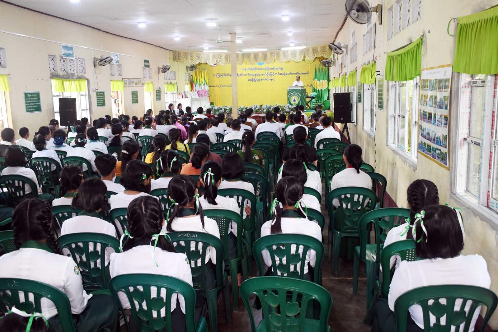 အခမ်းအနားတွင် တိုင်းဒေသကြီးဝန်ကြီးချုပ်ဦးမြတ်ကိုက“စာအုပ်စာပေသည် လူမျိုး၏ယဉ်ကျေးမှု မဏ္ဍိုင်ဖြစ်ပြီး စာအုပ်မျိုးစုံသည် လူသားများ၏ ခေတ်ကြေးမုံပြင်ဖြစ်ကြောင်း၊ စာအုပ်စာပေသည် လူသားများအတွက် မိတ်ဆွေကောင်းဖြစ်ပြီး စာပေမြင့်လာသည်နှင့်အမျှ လူမျိုးလည်းတင့်တယ် ဝင့်ကြွား လာမည်ဖြစ်ကြောင်း ” စာပေသည် နိုင်ငံနှင့်လူမျိုးအတွက် အသက်ဖြစ်သဖြင့်နိုင်ငံတော်အကြီးအကဲက လူငယ်များအနေဖြင့် စာအုပ်စာပေဖတ်ရှုကြရန်လိုအပ်ကြောင်း၊ နိုင်ငံတော်က လူငယ်များ စာပေဖတ်ရှုကြသည့် အလေ့အထဖြစ်ပေါ်လာရန် စာကြည့်တိုက်များဖွံ့ဖြိုးရေးနှင့် စာပေဝန်းကျင်ကောင်းများ ဖြစ်ထွန်းလာစေရန် အစဉ်အမြဲဖန်တီးဖော်ဆောင်ပေးလျက်ရှိကြောင်း၊ စာဖတ်ခြင်းသည်လူတစ်ဦးချင်းအလိုက် ကောင်းကျိုး များကို ဆောင်ကြဉ်းပေးနိုင်ပြီးအကြောင်းအကျိုး၊ အကောင်းအဆိုးကို ခွဲခြားသိမြင်နိုင်စွမ်းရှိသည့် အသိပညာနှင့်အတွေးအခေါ် များရရှိစေနိုင်ကြောင်း၊ လူငယ်လူရွယ်များအား ငယ်ရွယ်စဉ် အချိန်ကတည်းက စာဖတ်ခြင်း အလေ့အထကောင်းများ ပျိုးထောင်ပေးရန်အတွက် ကျောင်းစာကြည့်တိုက်များအသုံးပြုရန်လိုအပ်ကြောင်း၊ . ကျောင်းသား ကျောင်းသူ လူငယ်များအနေဖြင့် စာကြည့်တိုက်များကို အသုံးပြုပြီး စာအုပ်စာပေများ လေ့လာဖတ်ရှုကာ မိမိတို့၏ဘဝများ တိုးတက်ကောင်းမွန်အောင်ပြုစုပျိုးထောင်နိုင်ကြပြီး အသိပညာဗဟုသုတ ကြွယ်ဝလျက် အသိဉာဏ်ပညာပြည့်ဝပြီး နိုင်ငံ့အကျိုးကို သယ်ပိုးဆောင်ရွက်နိုင်မည့်လူတော် လူကောင်းများဖြစ်အောင် ကြိုးစားကြစေလိုကြောင်း ပြောကြားသည်။