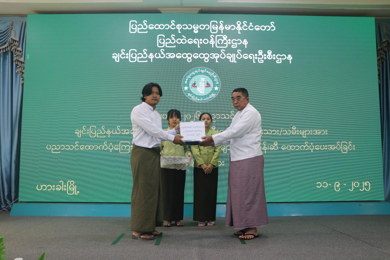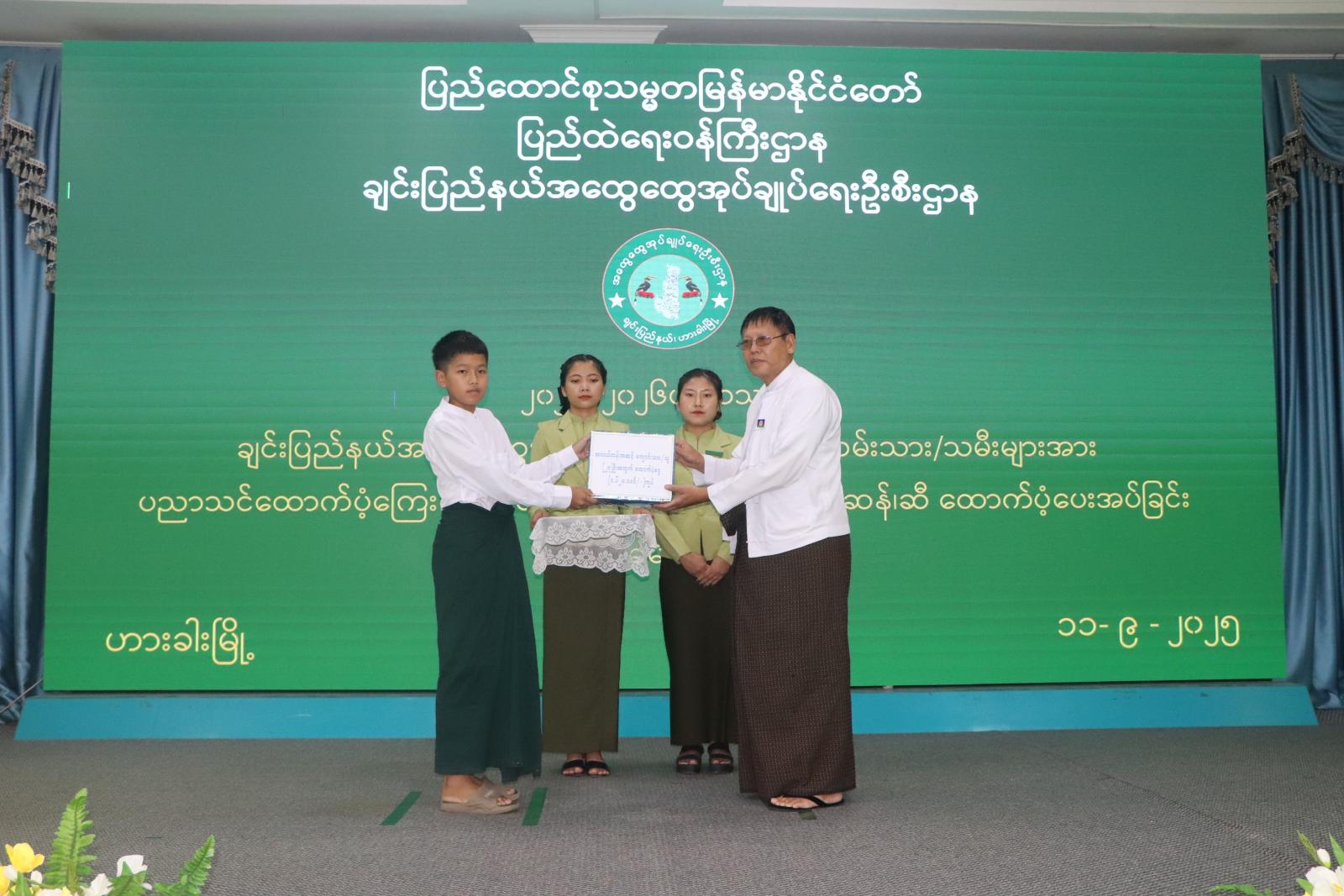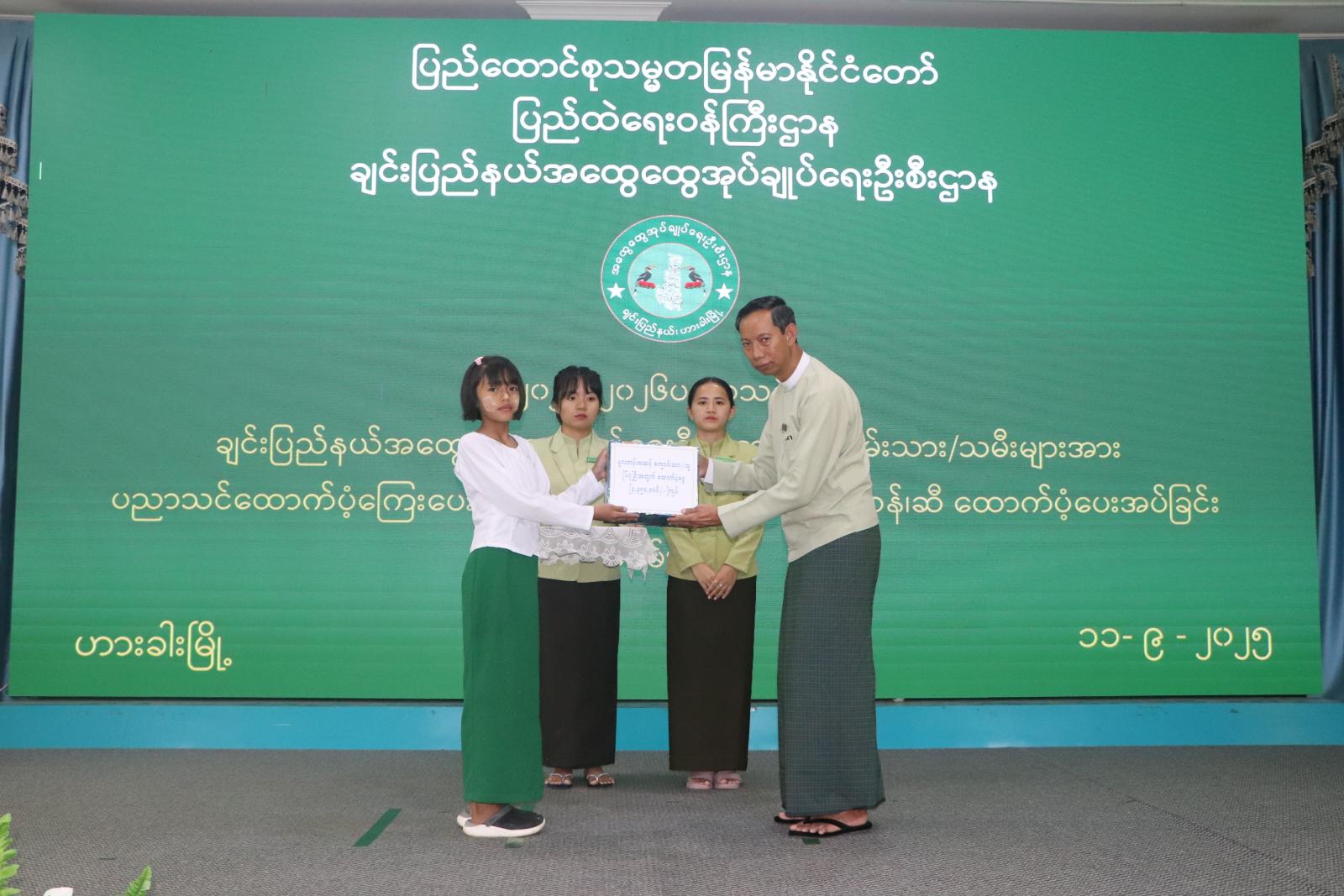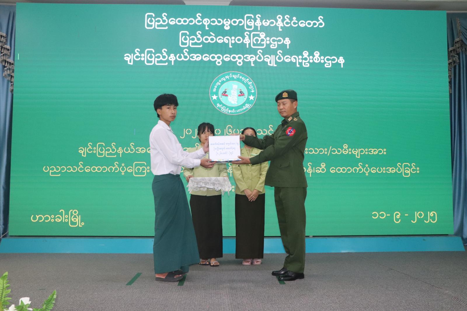 ထို့နောက် တက္ကသိုလ်အဆင့်နှင့် အခြေခံပညာအထက်တန်းအဆင့်တွင် ပညာသင်ကြားနေသော ဝန်ထမ်းသား၊ သမီးများနှင့် ချင်းပြည်နယ်အထွေထွေအုပ်ချုပ်ရေးဦးစီးဌာနတွင် တာဝန်ထမ်းဆောင်နေသော ဝန်ထမ်းများအား ပြည်နယ်ဝန်ကြီးချုပ် ဒေါက်တာဝုန်ဆွန်းထန်နှင့် လုံခြုံရေးနှင့် နယ်စပ်ရေးရာဝန်ကြီး ဗိုလ်မှူးကြီး ခင်မောင်ထွေကလည်းကောင်း၊ အခြေခံပညာအလယ်တန်းအဆင့်တွင် ပညာသင်ကြားနေသာ ဝန်ထမ်းသား၊ သမီးများနှင့် ပြည်နယ်အထွေထွေအုပ်ချုပ်ရေးဦးစီးဌာနတွင် တာဝန်ထမ်းဆောင်နေသော ဝန်ထမ်းများအား သယံဇာတရေးရာဝန်ကြီး ဦးကောလ်လျန်ထန်းကလည်းကောင်း၊ အခြေခံပညာမူလတန်းအဆင့်တွင် ပညာသင်ကြားနေသော ဝန်ထမ်းသား၊ သမီးများနှင့် ပြည်နယ်အထွေထွေအုပ်ချုပ်ရေးဦးစီးဌာနတွင် တာဝန်ထမ်းဆောင်နေသော ဝန်ထမ်းများအား ခေတ္တပြည်နယ်အုပ်ချုပ်ရေးမှူး ဦးမင်းဆွေကလည်းကောင်း ပညာသင်ထောက်ပံ့ကြေးနှင့် ဆန်၊ ဆီများပေးအပ်ကြပြီး ဝန်ထမ်းများနှင့် ဝန်ထမ်းသား၊ သမီးများကိုယ်စား ဒုတိယညွှန်ကြားရေးမှူး ဦးအောင်ကြည်တိုးက ကျေးဇူးတင်စကားပြန်လည်ပြောကြားကာ ပြည်နယ်ဝန်ကြီးချုပ်က ဝန်ထမ်းများနှင့် ဝန်ထမ်းသားသမီးများအား အားပေးစကားပြောကြားခဲ့ကြောင်း သိရသည်။