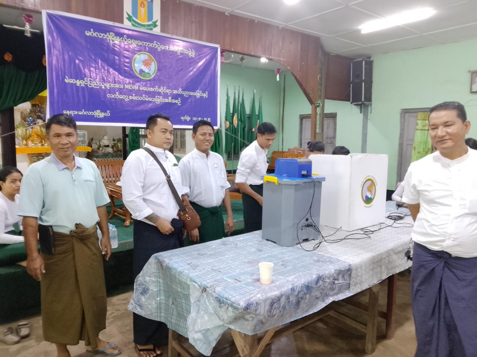 ဆက်လက်၍ မင်္ဂလာဒုံဈေးရပ်ကွက်မှ ပြည်သူ(၃၂၇၃)ဦး၊ ပြန်လည်နေရာချထားရေးရပ်ကွက်မှ ပြည်သူ(၅၄၆၁)ဦး၊ ပြည်တော်သာရပ်ကွက်(၁၇၃၅ဦးတို့က မြန်မာအီလက်ထရောနစ်မဲပေးစက် (MEVM) ဖြင့် လက်တွေ့စမ်းသပ်မဲပေးခဲ့ခြင်းကို ရပ်ကွက်နေမဲဆန္ဒရှင်ပြည်သူများနှင့်အတူ သက်ဆိုင်ရာဌာနဆိုင်ရာများ၊ ရပ်ကွက်အုပ်ချုပ်ရေးမှူးများက အနီးကပ်ကြီးကြပ်ပူးပေါင်းပါဝင်ဆောင်ရွက်ကြကြောင်း သိရသည်။