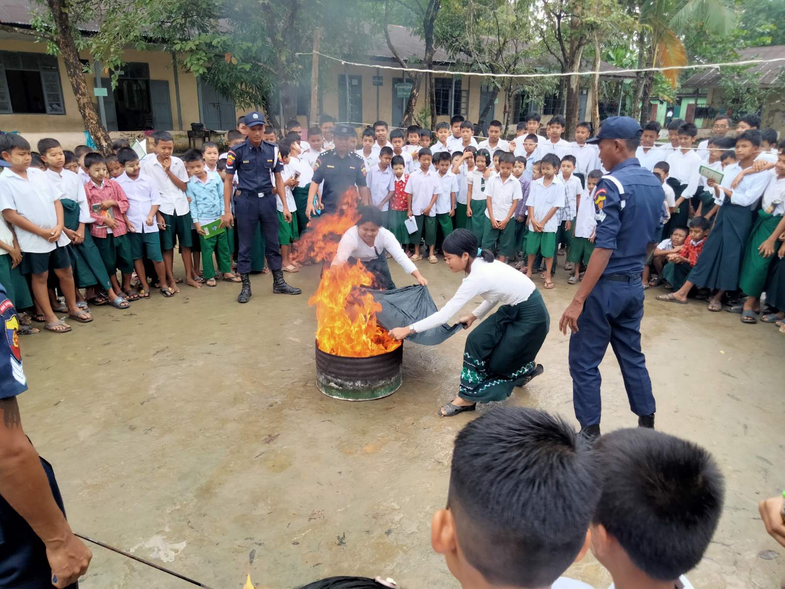 ထို့နောက် ရေစိုဝတ်ဖြင့် မီးငြိမ်းသတ်ပုံ၊ ဂတ်(စ်)မီးငြိမ်းသတ်ပုံ၊ မီးသတ်ဆေးဘူးဖြင့် မီးငြိမ်းသတ်ပုံတို့ကို ကျောင်းသား၊ ကျောင်းသူများနှင့်အတူ လက်တွေ့သရုပ်ပြဆောင်ရွက်ခဲ့ကြသည်။