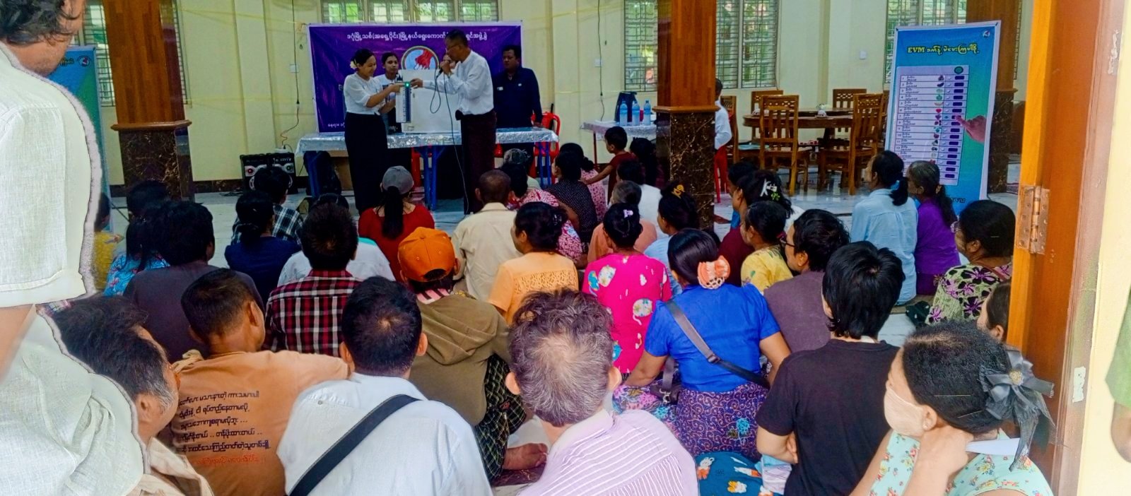 ဒဂုံ စက်တင်ဘာ ၁၃ ရန်ကုန်တိုင်းဒေသကြီး၊ ဒဂုံမြို့သစ်ခရိုင်၊ ဒဂုံမြို့သစ်(အရှေ့ပိုင်း)မြို့နယ်တွင် မဲဆန္ဒရှင်ပြည်သူများအား မြို့နယ်ရွေးကောက်ပွဲကော်မရှင်အဖွဲ့ခွဲမှ မြန်မာအီလက်ထရောနစ်မဲပေးစက် (MEVM) နှင့်ပတ်သက်၍ အသိပညာပေးခြင်းနှင့် လက်တွေ့စမ်းသပ်မဲပေးခြင်းများကို ယနေ့နံနက် (၉)နာရီမှ ညနေ (၃)နာရီအထိ အမှတ်(၁၃၄)၊ (၁၃၆)၊ (၁၃၃)ရပ်ကွက်များရှိ သတ်မှတ်စုရပ်နေရာများ၌ ဆောင်ရွက်ခဲ့ကြသည်။ အဆိုပါသတ်မှတ်စုရပ်နေရာများဖြစ်သော ဒဂုံအောင်မြေဘုန်းကြီးကျောင်း၊ သာသနာ့ရိက္ခတဓမ္မာရုံ၊ အ.ထ.က(၅)တို့၌ ရပ်ကွက်နေမဲဆန္ဒရှင် ပြည်သူများအား ရွေးကောက်ပွဲနှင့်ပတ်သက်၍ မြို့နယ်ရွေးကောက်ပွဲကော်မရှင်အဖွဲ့ခွဲ အဖွဲ့ဝင်များ၊ ကြီးကြပ်သူအရာရှိများနှင့် တာဝန်ရှိသူများက အသိပညာပေး ရှင်းလင်းပြောကြားသည်။ ဆက်လက်၍ (၁၃၃)၊ (၁၃၄)၊ (၁၃၆)ရပ်ကွက်များမှ ပြည်သူ (၁၈၀၀)ဦးတို့က မြန်မာအီလက်ထရောနစ်မဲပေးစက် (MEVM) ဖြင့် လက်တွေ့စမ်းသပ်မဲပေးခဲ့ခြင်းကို ရပ်ကွက်နေ မဲဆန္ဒရှင်ပြည်သူများနှင့်အတူ သက်ဆိုင်ရာဌာနဆိုင်ရာများ၊ ရပ်ကွက်အုပ်ချုပ်ရေးမှူးများက အနီးကပ်ကြီးကြပ် ပူးပေါင်းပါဝင်ဆောင်ရွက်ကြကြောင်း သိရသည်။ အေးမဉ္ဇူ ရန်ကုန်တိုင်းဒေသကြီး အမြို့မြို့အနယ်နယ်သတင်းများ