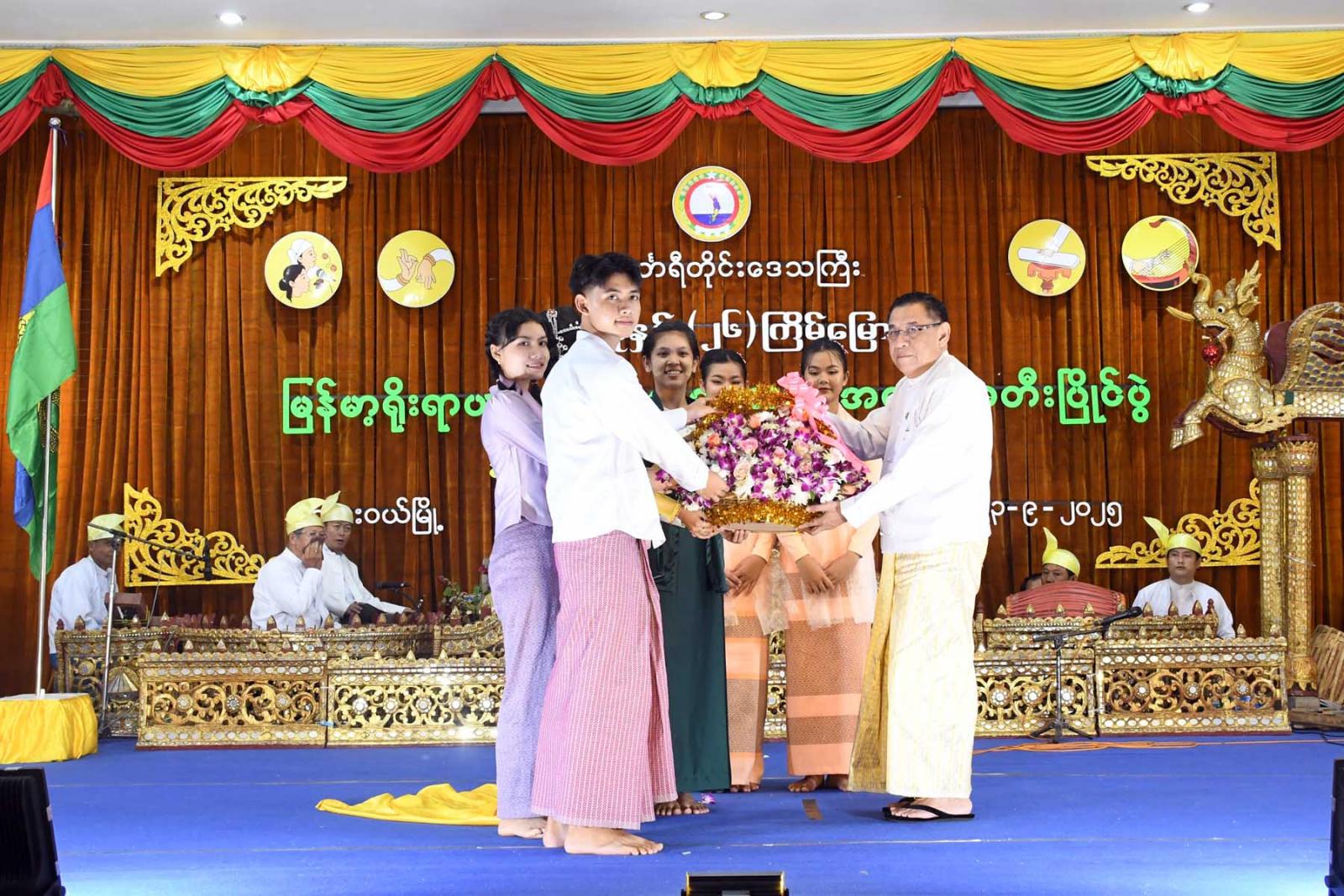 ဆက်လက်၍ အဆို၊ အက၊ အရေး၊ အတီးပြိုင်ပွဲကျင်းပရေးဦးစီးကော်မတီနာယက တိုင်းဒေသကြီးဝန်ကြီးချုပ်က ပြိုင်ပွဲအထိမ်းအမှတ် ဂုဏ်ပြုပန်းခြင်းအား ပေးအပ်ပြီး ဒိုင်ချုပ်အဖွဲ့နှင့် အကဲဖြတ် ဒိုင်အဖွဲ့ခေါင်းဆောင်များကို ဂုဏ်ပြုဆုငွေနှင့်ဂုဏ်ပြုလက်မှတ်ချီးမြှင့်သည်။