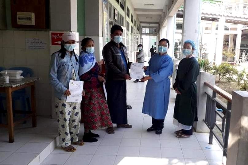 “ ဂန့်ဂေါမြို့ ကုတင်(၁၀၀)ဆံ့ ခရိုင်ပြည်သူ့ဆေးရုံကြီး အထူးကြပ်မတ်ဆောင်မှာ ဆေးကုသမှု ခံယူနေတဲ့ လူနာ(၅)ဦးဟာ ရောဂါများ သက်သာ ပျောက်ကင်းတဲ့အတွက် ဆင်းခွင့်ပြုလိုက်တာပါ၊ သူတို့ကို ဒီဇင်ဘာ ၁၁ ရက်နေ့က RDT စက်ဖြင့်စစ်ဆေးတွေ့ရှိတာပါ၊ (ID:105561) (ID:105562) (ID:106439) (ID:106440) နှင့် (ID:106441)တို့ဖြစ်ပါတယ်၊ သူတို့ကို အိမ်မှာ (၇) ရက် အသွားအလာ ကန့်သတ်ထားရှိပြီး နေထိုင်သွားဖို့ကို မှာကြားခဲ့ တယ်”ဟု ဂန်ဂေါခရိုင် ပြည်သူ့ဆေးရုံမှ တာဝန်ရှိသူ တစ်ဦးကပြောသည်။