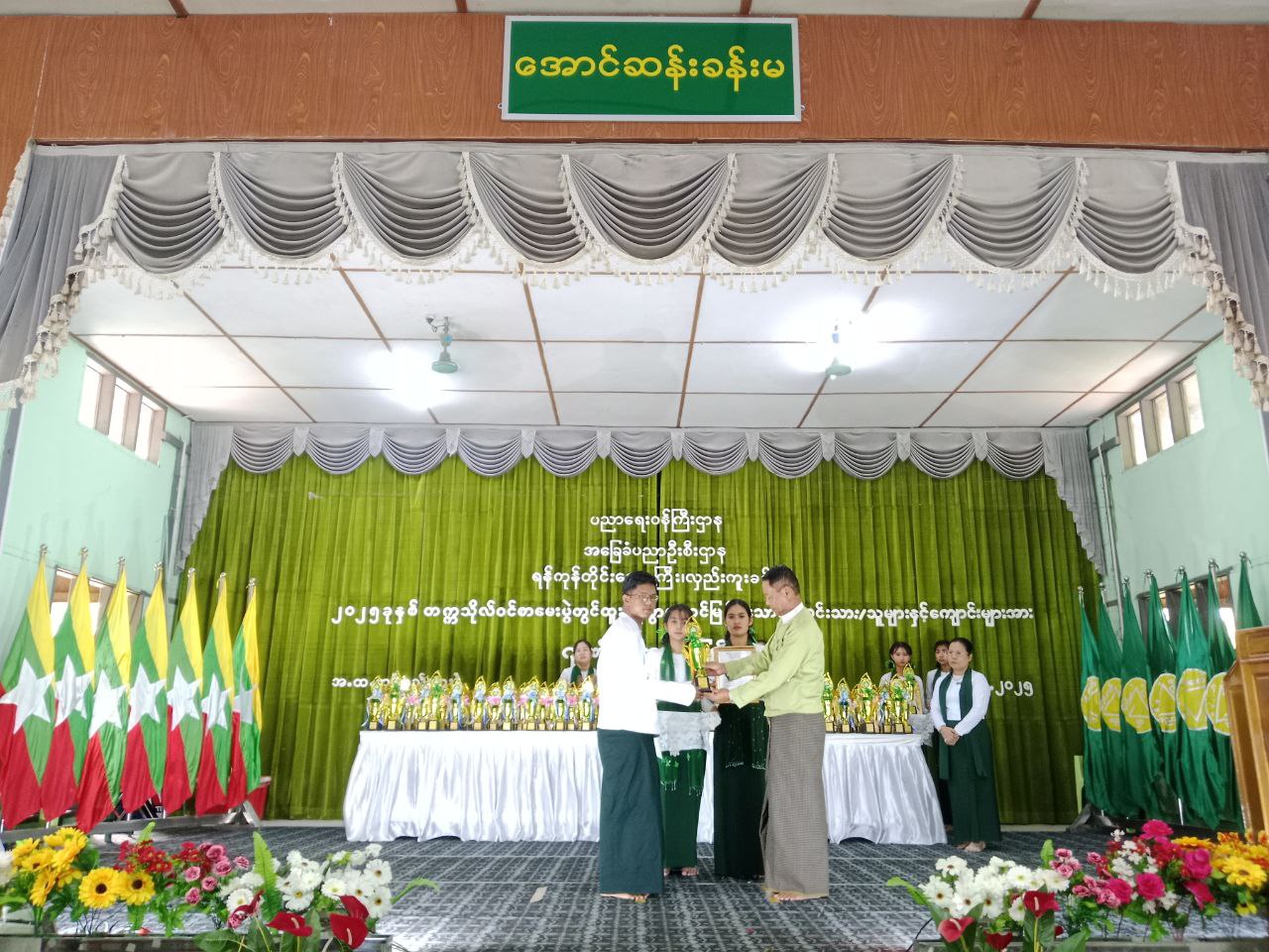 ရန်ကုန်တိုင်းဒေသကြီး၊ လှည်းကူးခရိုင်၊ လှည်းကူးမြို့နယ်၌ ၂ဝ၂၅ ခုနှစ် တက္ကသိုလ်ဝင်စာမေးပွဲတွင် ထူးချွန်စွာအောင်မြင်ခဲ့သည့် ကျောင်းသား၊ ကျောင်းသူများနှင့် ကျောင်းအား ဂုဏ်ပြုဆုချီးမြှင့်ပွဲအခမ်းအနားကို ယမန်နေ့နံနက်ပိုင်းက အခြေခံပညာအထက်တန်းကျောင်း (လှည်းကူး) အောင်ဆန်းခန်းမ၌ ကျင်းပသည်။