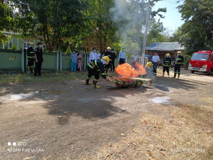 ထိုသို့ မီးဘေးကြိုတင်ကာကွယ်ရေး သရုပ်ပြဇာတ်တိုက်လေ့ကျင့်ခြင်း လုပ်ငန်းများ ဆောင်ရွက်ရာ တွင်ပွင်းလင်းရာသီ ရောက်ရှိ လာပြီဖြစ်၍ ဌာနဆိုင်ရာရုံးများနှင့် ဒေသခံပြည်သူများအနေဖြင့် မီးဘေးကြိုတင် ကာကွယ်ရေးနှင့် မီးဘေးလုံခြုံစိတ်ချရမှု ရှိစေရေးအတွက်မီးငြိှမ်းသတ်နည်း ဇာတ်တိုက်လေ့ကျင့် သရုပ်ပြခြင်း၊ မီးဘေးကြိုတင်ကာကွယ်ရေးဆောင်ရွက်ချက်များ၊ လျှပ်စစ်မီး သုံးစွဲရာတွင် မီးဘေးအန္တရာယ်မဖြစ်အောင် စနစ်တကျကိုင်တွယ်အသုံးပြုနည်းများ၊ မီးဘေး အန္တရာယ်ကြုံတွေ့လာပါက မီးသတ်ဆေးဗူး အသုံးပြု၍ မီးငြှိမ်းသတ်နည်းစနစ်များ မီးလောင် မှုဖြစ်ပါက မီးသတ်ဦးစီးဌာနသို့ အချိန်နှင့်တပြေးညီ သတင်း ပေးပို့သွားရန် စသည့် မီးဘေးကြိုတင် ကာကွယ်ရေးဆိုင်ရာ အသိပညာပေးခြင်းလုပ်ငန်းများကို မြို့နယ်မီးသတ်ဦးစီးဌာနမှ ဦးစီး အရာရှိ ဦးဌေးမော်က ဆွေးနွေးပြောကြားခဲ့ပြီး မီးငြိှမ်းသတ်နည်း သရုပ်ပြ ခြင်းအတွက် မြို့နယ်မီးသတ် ရေယာဉ် (၂)စီးဖြင့် သရုပ်ပြလေ့ကျင့်ခြင်း ဆောင်ရွက်ခဲ့ရာ မြို့နယ်မီးသတ်ဦးစီးဌာနမှ ဦးစီးအရာရှိ ဦးဌေးမော်နှင့် မီးတပ်ဖွဲ့ဝင်များ၊ ဆည်မြောင်းနှင့် ရေအသုံးချမှုစီမံခန့်ခွဲရေး ဦးစီးဌာနမှ ဦးစီးအရာရှိ (မြို့ပြ) ဦးထိန်လင်းနှင့် ဝန်ထမ်းများ လက်တွေ့မီးငြှိမ်းနည်းများကို ပူးပေါင်း ဆောင်ရွက်ခဲ့ကြောင်း သိရသည်။