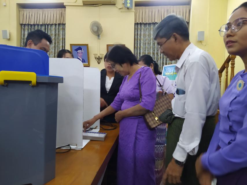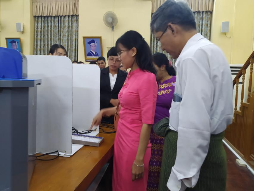 ရန်ကုန်ဒေသကြီး၊ ကမာရွတ်ခရိုင်၊ ကမာရွတ်မြို့နယ်၌ ဒေသခံမဲဆန္ဒရှင်ပြည်သူများ ပူးပေါင်းပါဝင်မှုဖြင့် မြန်မာ့အီလက်ထရောနစ်မဲပေးစက်ဆိုင်ရာ အသိပညာပေးဆွေးနွေးပွဲနှင့် လက်တွေ့စမ်းသပ်မဲပေးခြင်းအခမ်းအနားကို ယနေ့နံနက်ပိုင်းက အမှတ် (၉) ရပ်ကွက်၊ ရန်ကုန်တက္ကသ်ုလ်(ဝိဇ္ဇာခန်းမ)၌ ကျင်းပခဲ့သည်။