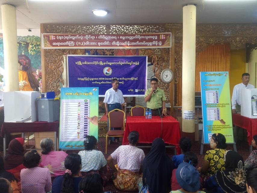 မြန်မာအီလက်ထရောနစ်မဲပေးစက် (MEVM) အသုံးပြုခြင်း အသိပညာပေးရှင်းလင်းခြင်းနှင့် မဲပေးစက်လက်တွေ့သရုပ်ပြမဲပေးခြင်းကို တာဝန်ရှိသူများက ယနေ့နံနက် ၉ နာရီမှ ညနေ ၄ နာရီအထိ နှစ်ပိုင်းခွဲကာ (၇၁) ရပ်ကွက် သန္တိသုခဓမ္မာရုံနှင့် (၇၂) ရပ်ကွက် သဟပုညကာရီဓမ္မာရုံတို့တွင် ဆောင်ရွက်ကြသည်။