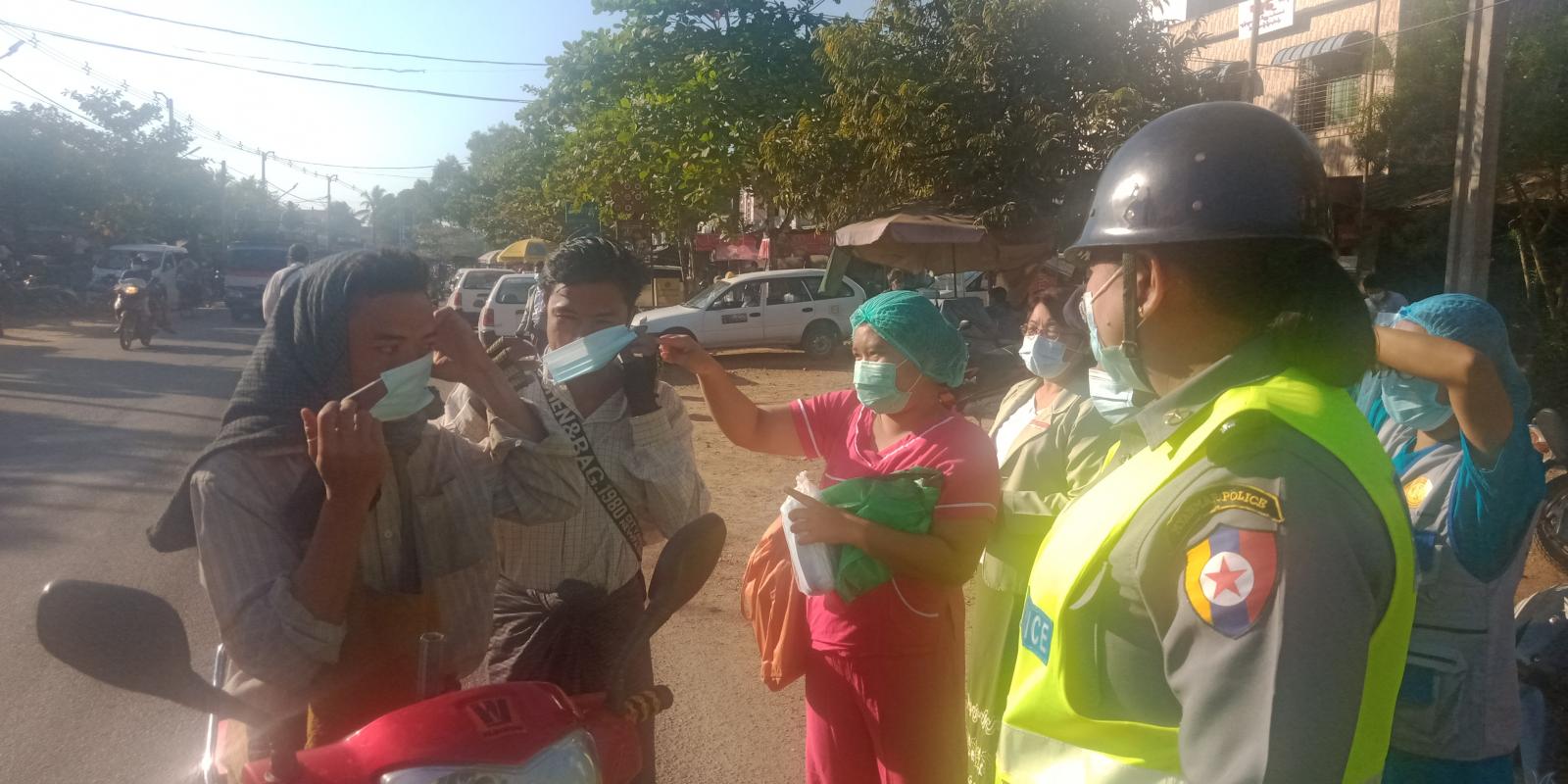 ထို့သို့ Mask Campaign ဆောင်ရွက်ရာတွင် မြို့နယ်ကိုဗစ်-၁၉အရေးပေါ်တုံ့ပြန်ရေး ကော်မတီ ဝင်များ၊ မြို့နယ်ရဲ တပ်ဖွဲ့ဝင်များ၊ မြို့နယ်ပြည်သူ့ကျန်းမာရေးဦးစီးဌာနမှ ကျန်းမာရေး ဝန်ထမ်းများ၊ အထွေထွေအုပ်ချုပ်ရေး ဦးစီးဌာနမှဝန်ထမ်းများ၊ ယာဉ်ထိန်းရဲတပ်ဖွဲ့ဝင်များ၊ ဌာနဆိုင်ရာများ၊ ကြက်ခြေနီသူနာပြုတပ်ဖွဲ့ဝင်များ၊ စည်ပင်သာ ယာရေးအဖွဲ့မှ ဝန်ထမ်းများ၊ မီးသတ်တပ်ဖွဲ့ဝင်များပူးပေါင်း၍ ကားများ၊ ဆိုင်ကယ်များ၊ လမ်းသွားလမ်းလာများတွင် နှာခေါင်းစည်းမတပ်ဆင်ဘဲ ဖြတ်သန်းသွားလာပါက နှာခေါင်းစည်း (Mask) အခမဲ့တပ်ဆင်ပေးခြင်းနှင့် အသိပညာပေးမှု များဆောင်ရွက်နေကြောင်း သိရသည်။