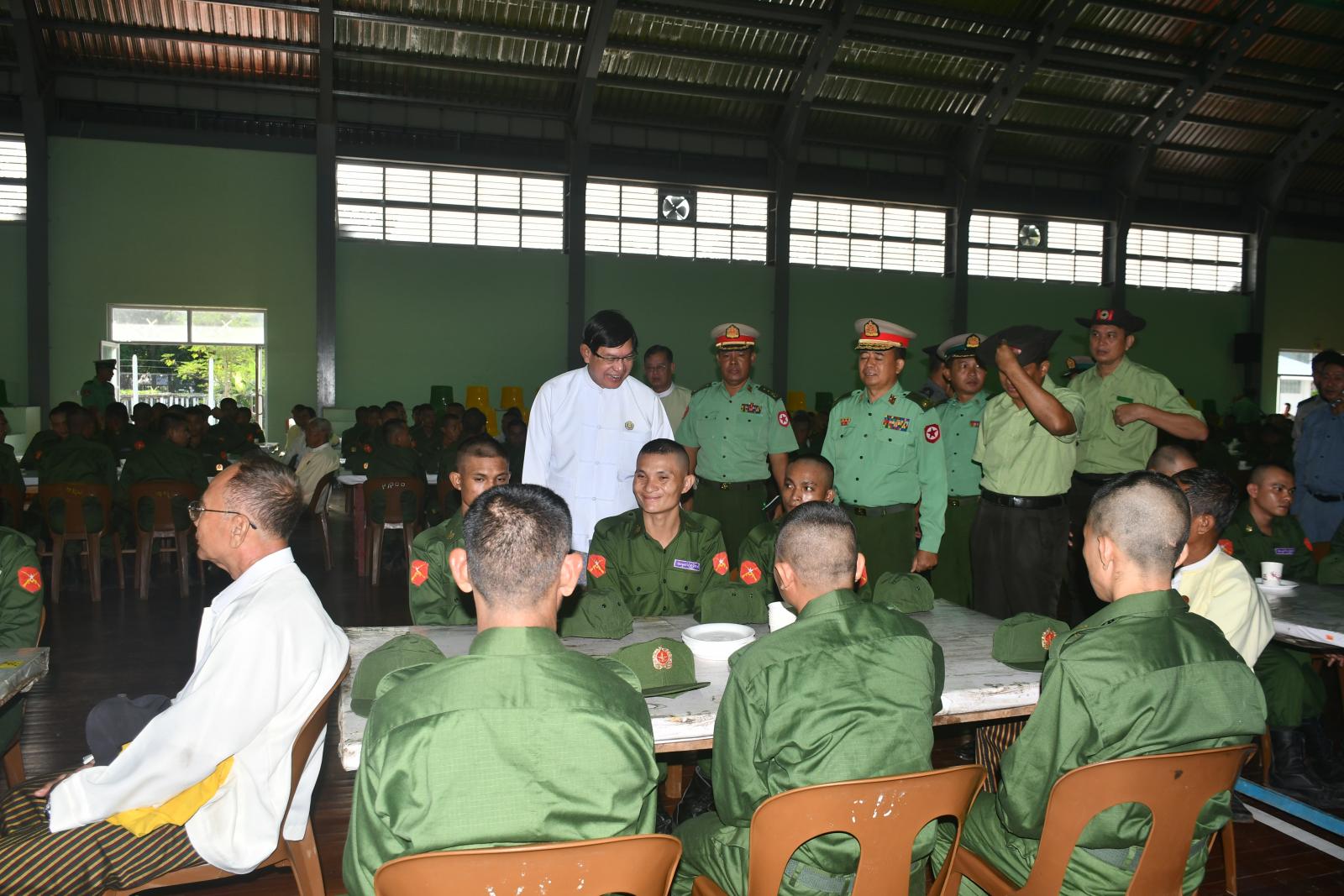 ဆက်လက်၍ ရန်ကုန်တိုင်းဒေသကြီးဝန်ကြီးချုပ် ဦးစိုးသိန်းက အမှာစကားပြောကြားကာ သင်တန်းသားတပ်ခွဲများကို ရင်းရင်းနှီးနှီး လိုက်လံနှုတ်ဆက်ကြပြီး တိုင်းဒေသကြီး ဝန်ကြီးချုပ်က စားသောက်ဖွယ်ရာများနှင့် ဂုဏ်ပြုချီးမြှင့်ငွေများပေးအပ်ရာ ကျောင်းအုပ်ကြီးက လက်ခံရယူသည်။