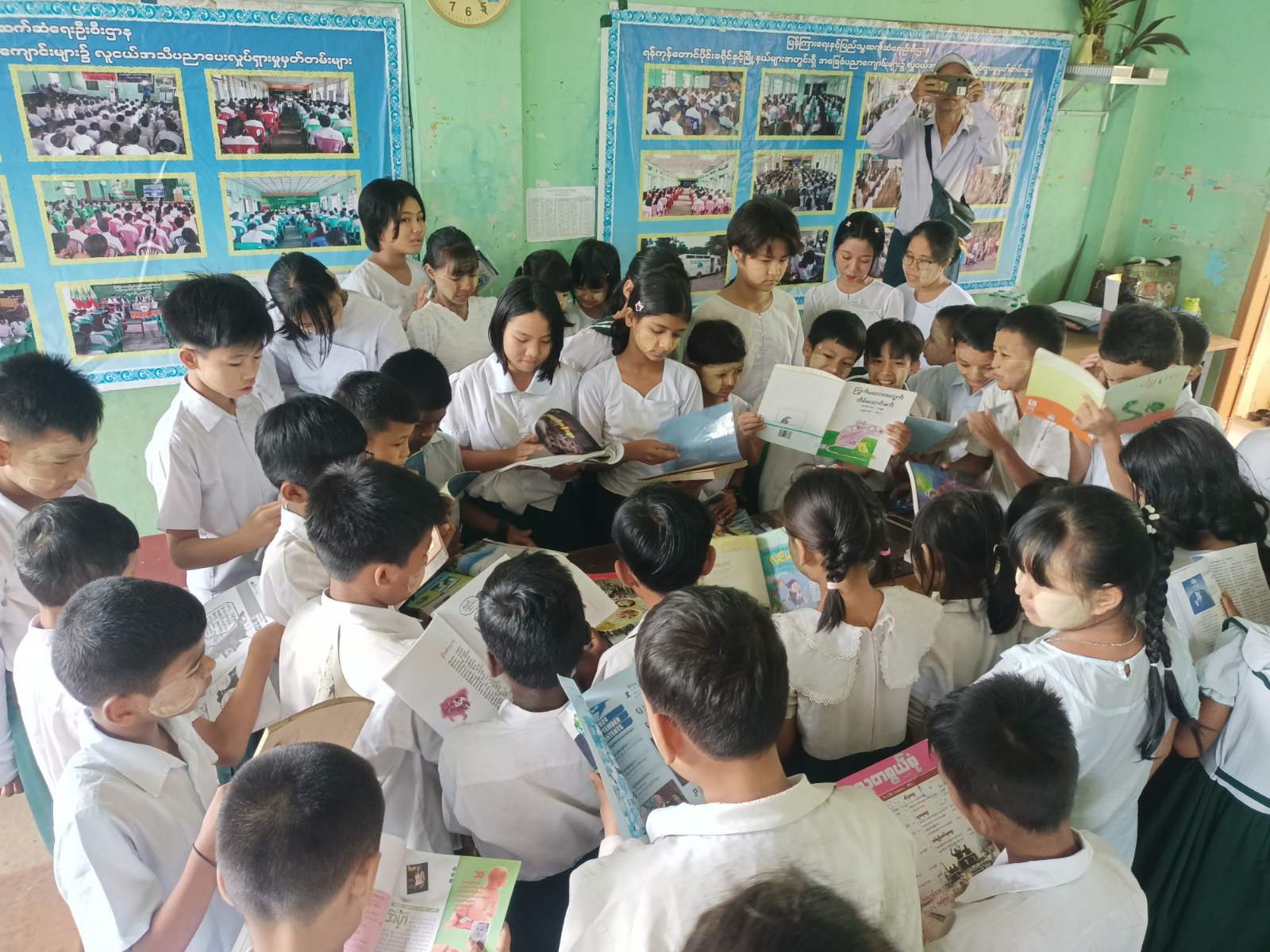 ဆက်လက်၍ ခရိုင်ပြန်ကြားရေးနှင့်ပြည်သူ့ဆက်ဆံရေးဦးစီးဌာနမှ ခင်းကျင်းပြသထားသည့် စာအုပ်စာစောင်များနှင့် နံရံကပ်စာစောင်များအား ကျောင်းသား/ကျောင်းသူများက စိတ်ဝင်စားစွာလေ့လာကြည့်ရှုခဲ့ကြောင်း သိရသည်။