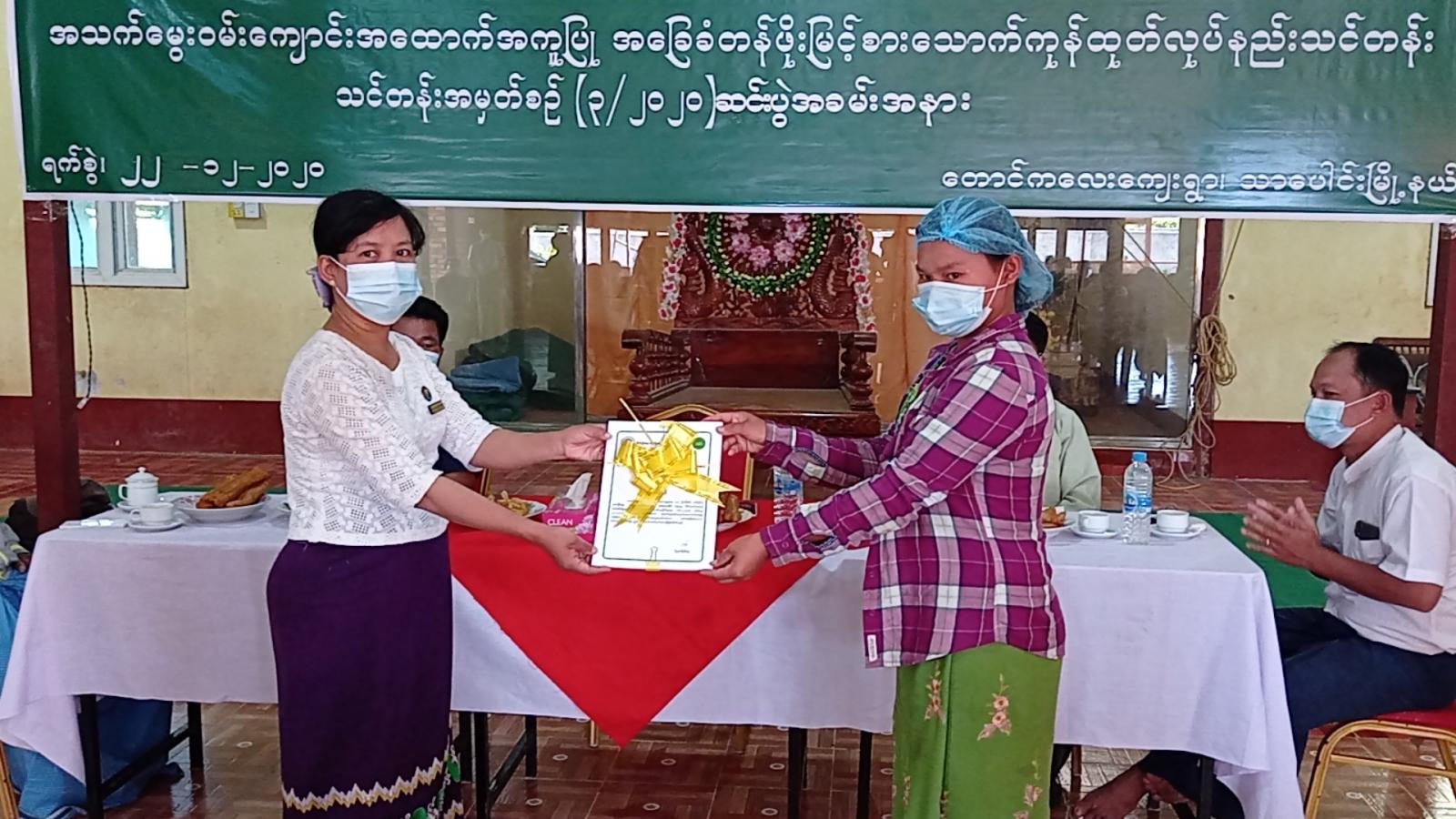 ကျေးလက်ဒေသ ဖွံ့ဖြိုးတိုးတတ်ရေးဦးစီးဌာမှ ဖွင့်လှစ်သော အသက်မွေး၀မ်းကျောင်း အထောက်အကူပြု အခြေခံတန်ဖိုးမြင့် စားသောက်ကုန် ထုတ်လုပ်နည်း သင်တန်း အမှတ်စဉ် (၃/၂၀၂၀) သင်တန်းဆင်းအောင်လက်မှတ်နှင့် ထူးချွန်ဆုများ ပေးအပ်ချီးမြှင့်ခြင်း အခမ်းအနားကို ကိုဗစ်-၁၉ရောဂါ ဆိုင်ရာ ကျန်းမာရေး စည်းကမ်းချက်များနှင်အညီ ကျင်းပပြုလုပ်ခဲ့ကြောင်း သိရသည်။